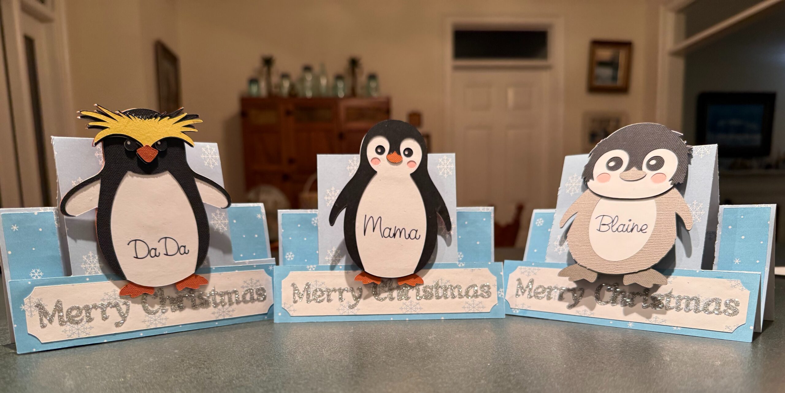 Used the penguins from this Christmas event to make these cards – they have a gift carder holder on the inside. I added a bobble thingie to put the penguins on the front of the card. Super cute!