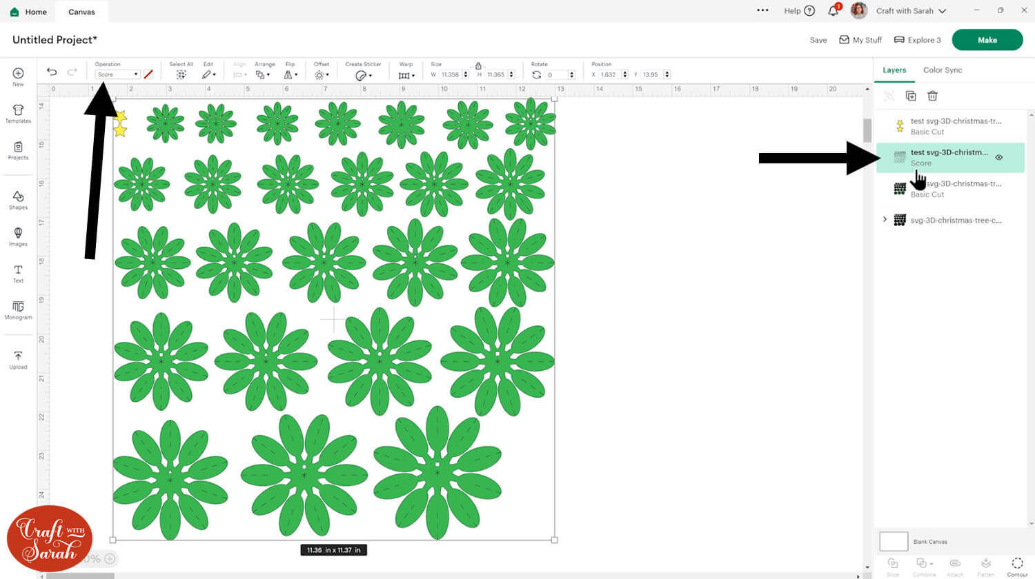 In this file, the green shapes and score lines are joined together as one individual layer which means you’ve only got one score line to change in Design Space.