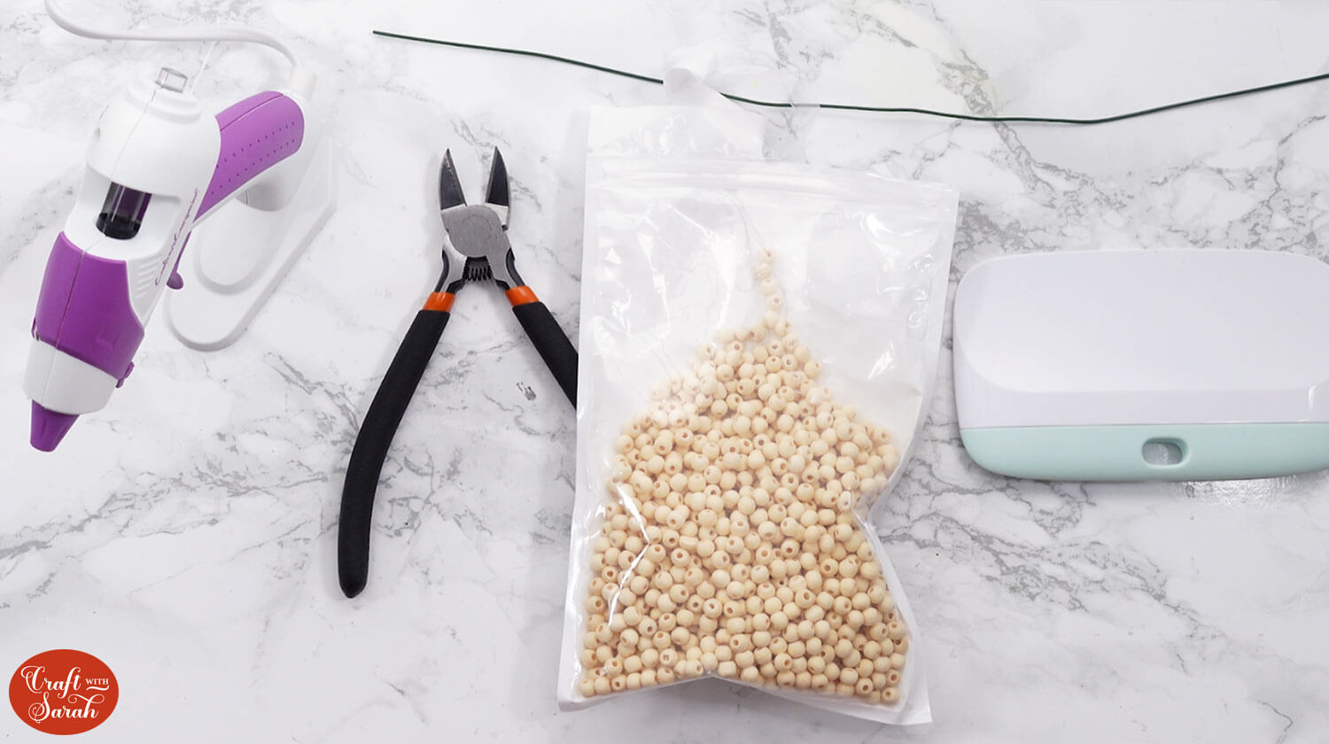 For this part, you will need a thick, but bendable, wire. You will also need a hot glue gun and some beads. If you don’t have any beads, you could use a dab of glue from your glue gun between each piece. This will help to spread out the pieces to make a realistic tree.