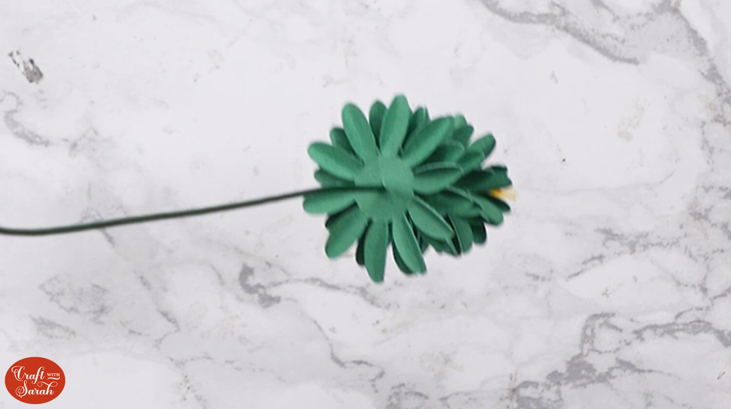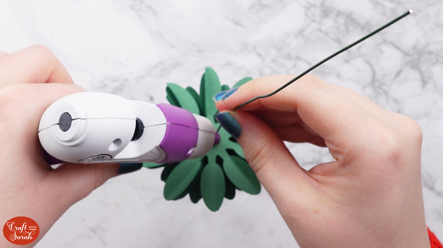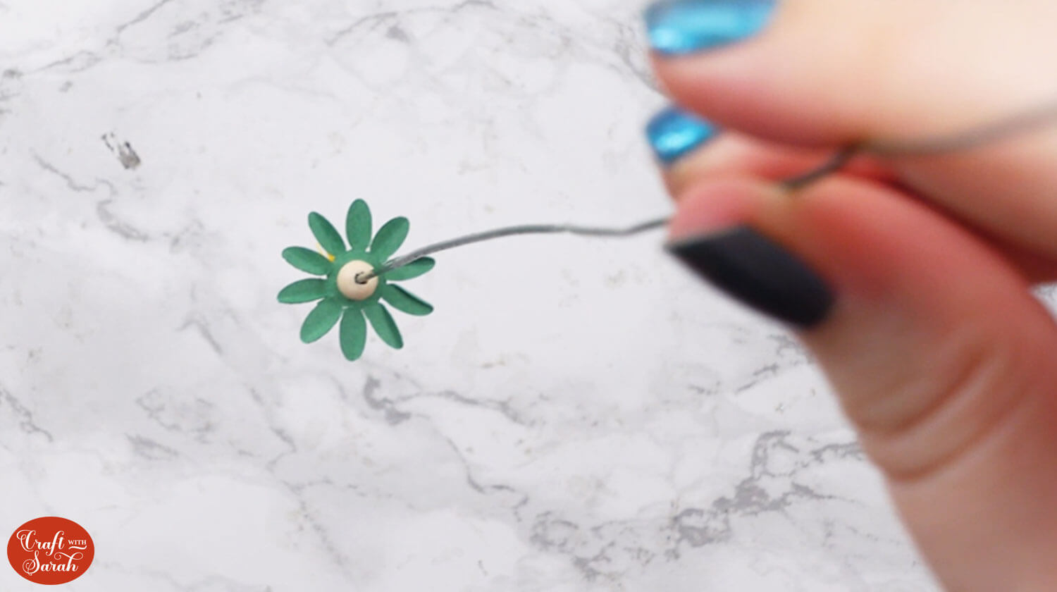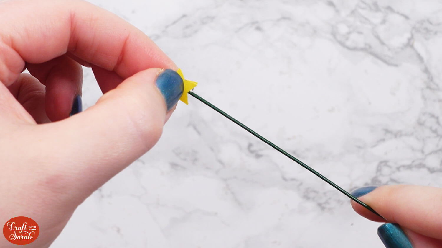 Then take the very smallest piece of the tree and poke the wire through the crosshatch in the middle. You want it so all the lines we folded are all pointed downwards.
