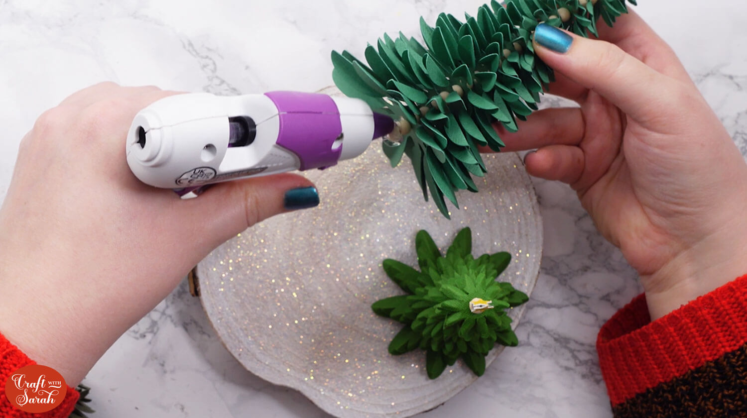 When all your trees are finished, add a big blob of hot glue to the bottom of them to stick them to your centrepiece base.