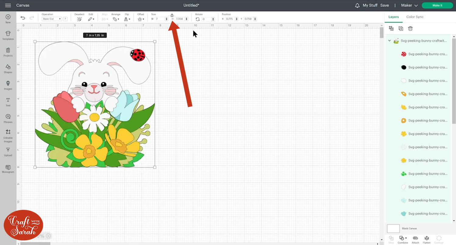 I cut my design at 7 inches wide (7.354 inches tall). I don’t recommend going smaller than about 5 inches wide as some of the cuts will get a little bit too tiny and hard to stick.
