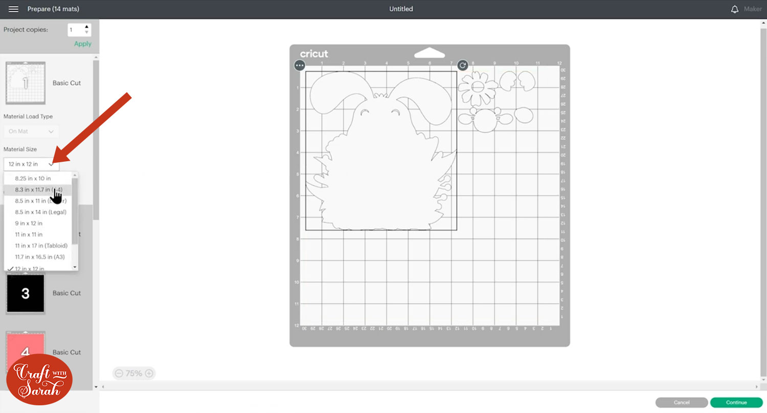 To change the paper size, go into the dropdowns over on the left side of the screen and choose the paper size that you want to use. You need to change it for every single colour.