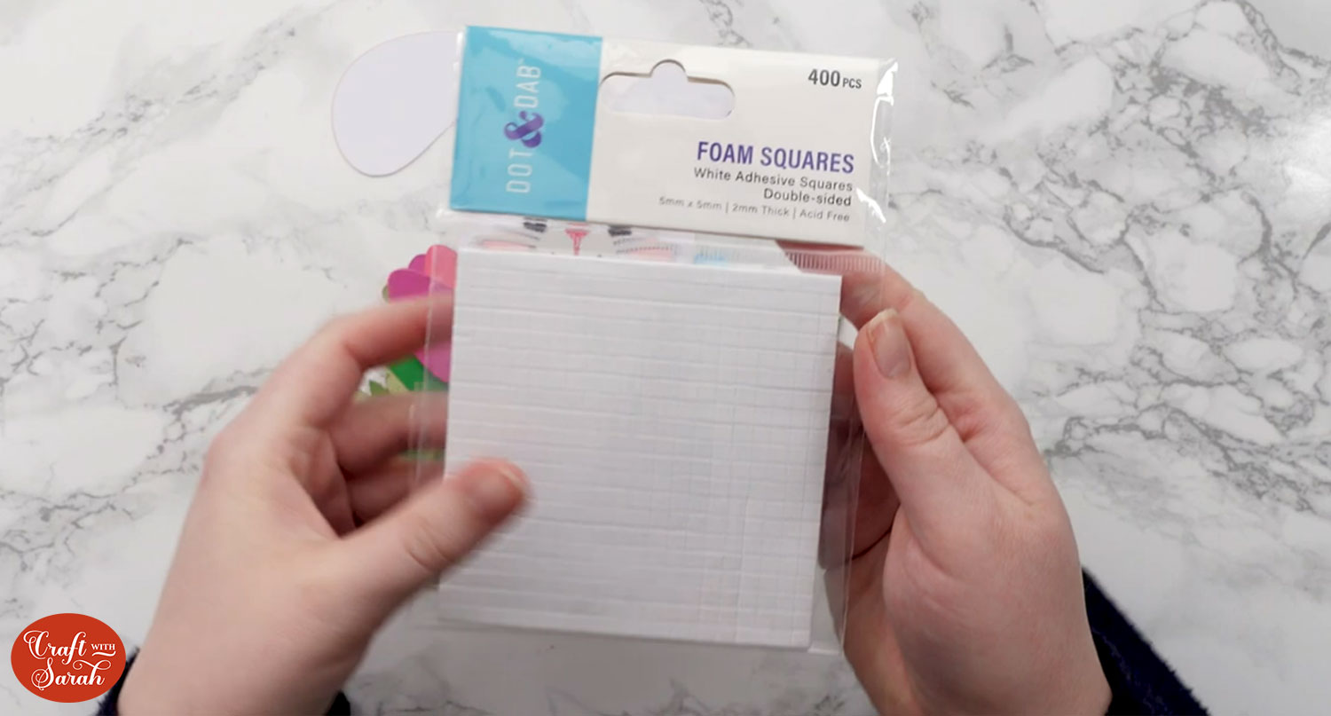 The foam pads that I use are from “Dot & Dab”, but any foam squares will work. If yours are big then you may need to cut them smaller with scissors to fit inside the edges of the layers.
