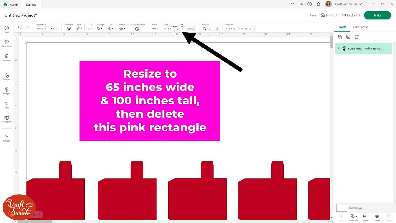 The whole design should be sized to 65 inches wide and 100 inches tall. There is a pink rectangle on the design that lists out those sizes to make it easy to remember.