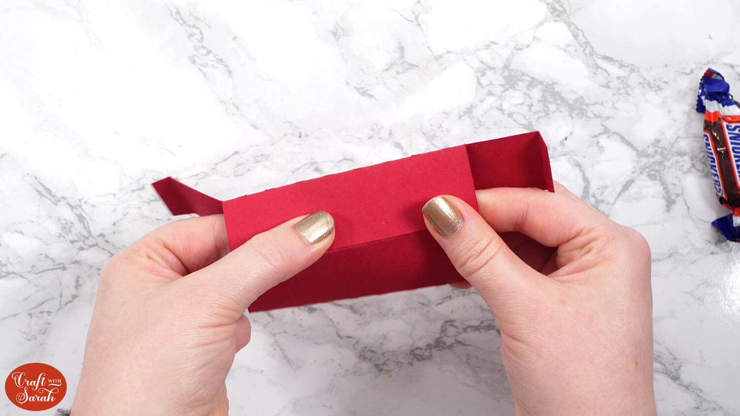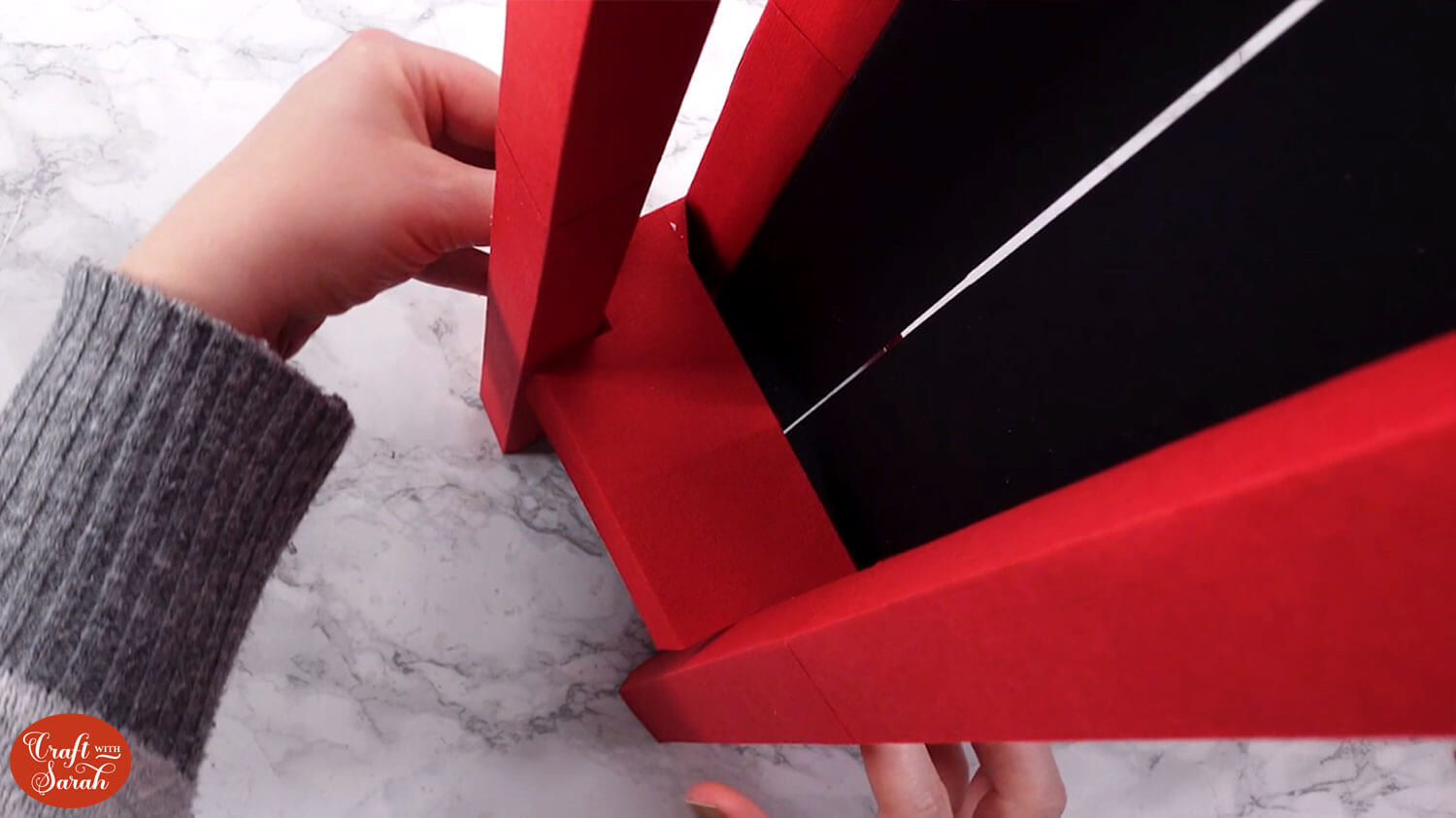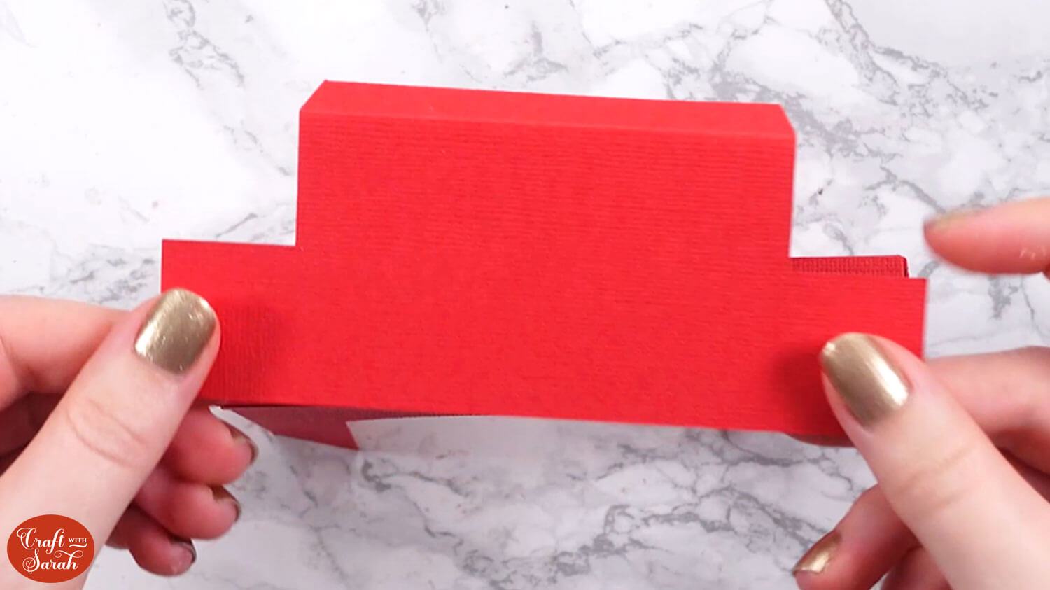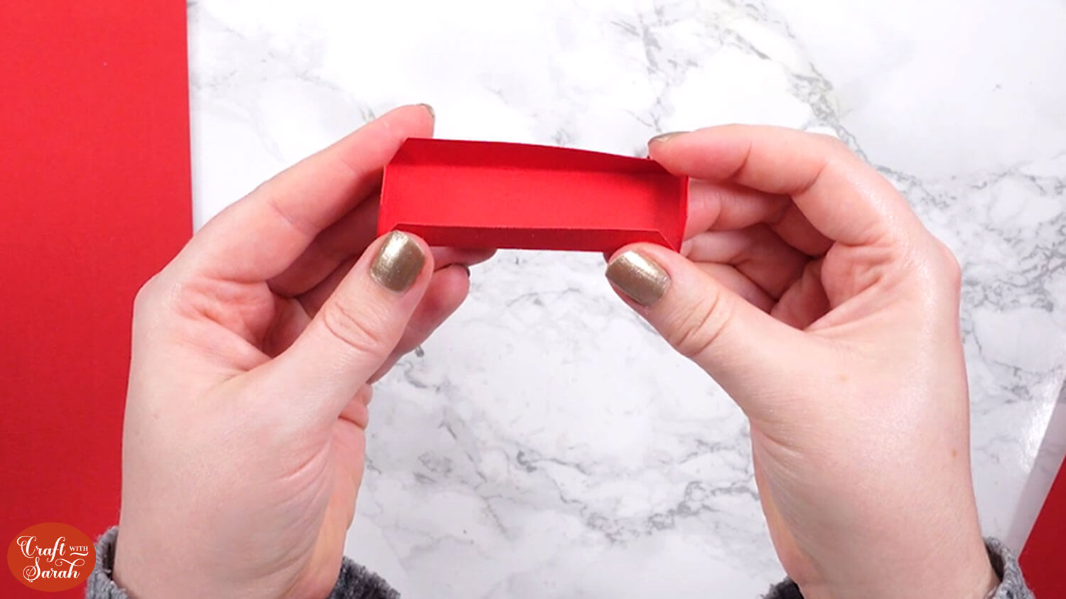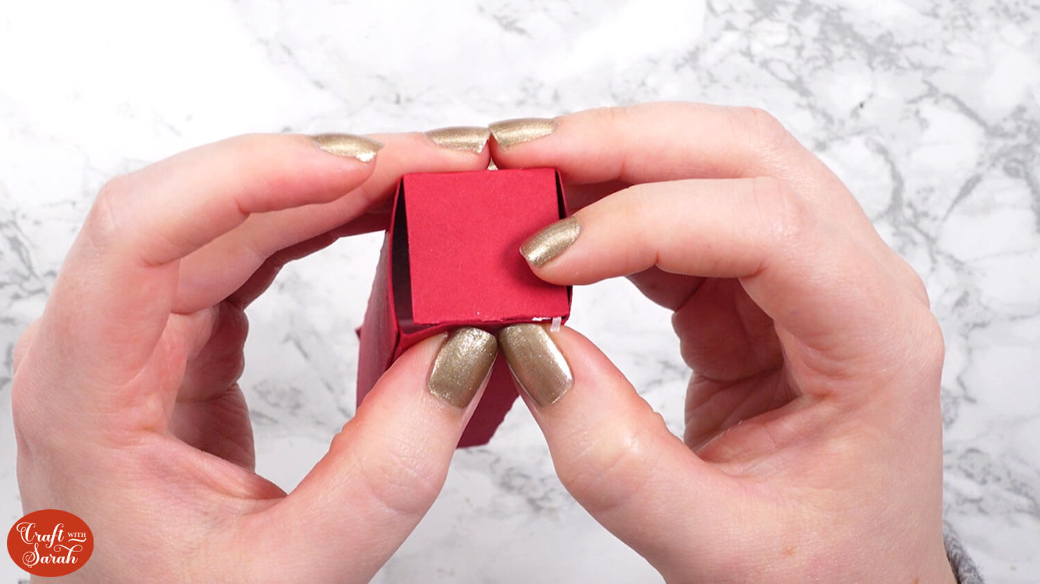 Use double-sided tape or glue to attach the “tab” end of the central section to the inside of the opposite side, to turn it into a box shape.