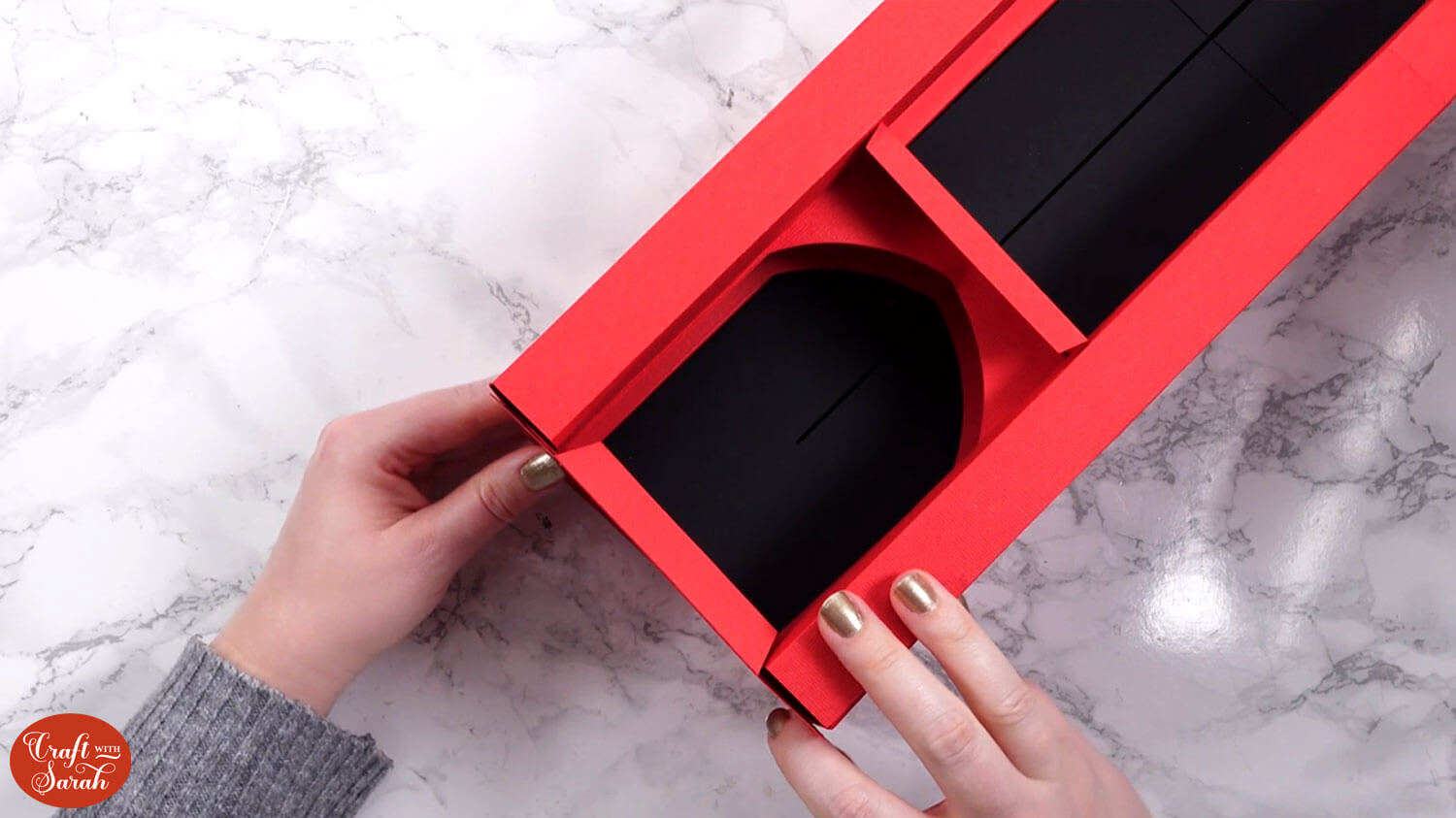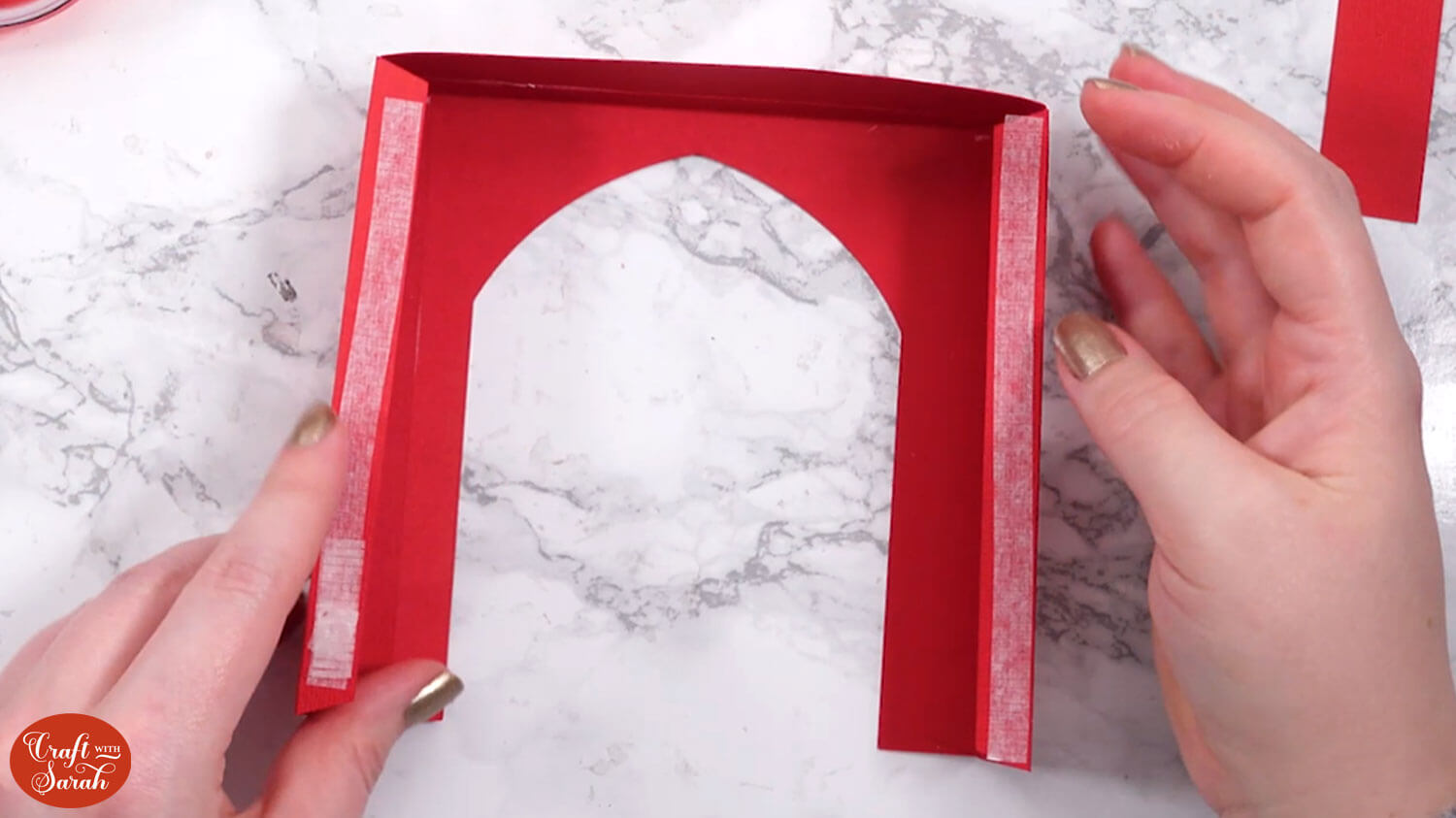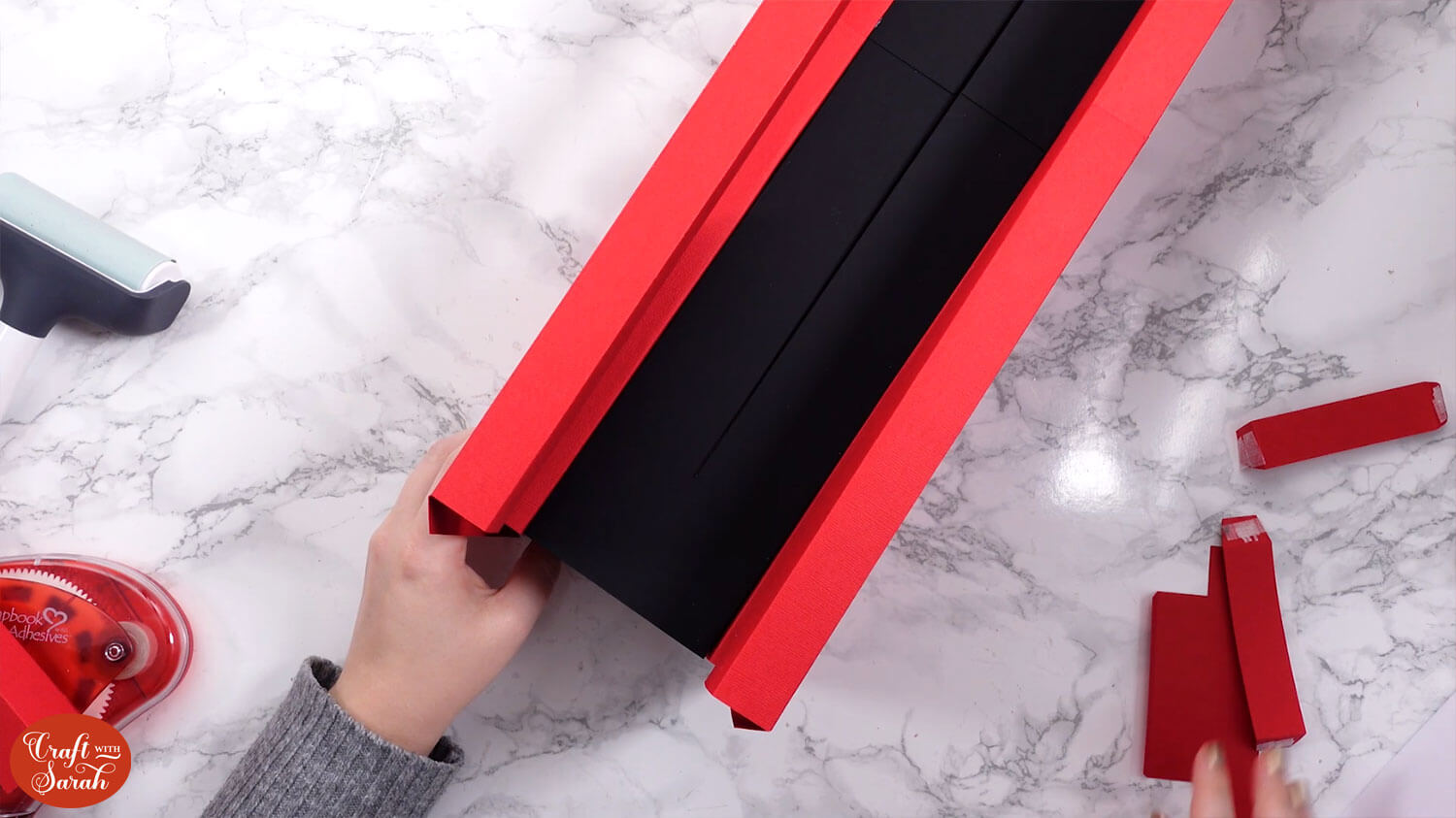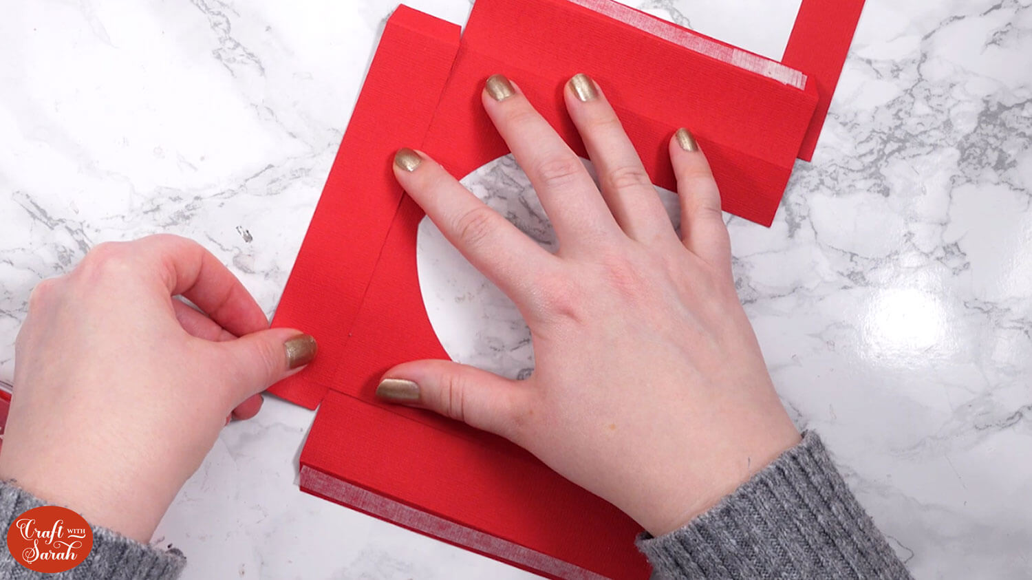 Use double-sided tape or glue to attach the “tab” end of the central section to the inside of the opposite side, to turn it into a box shape.