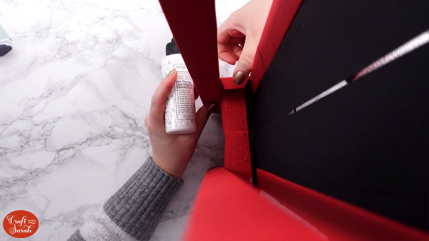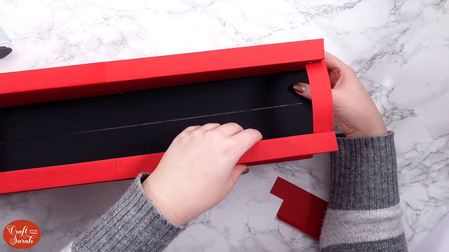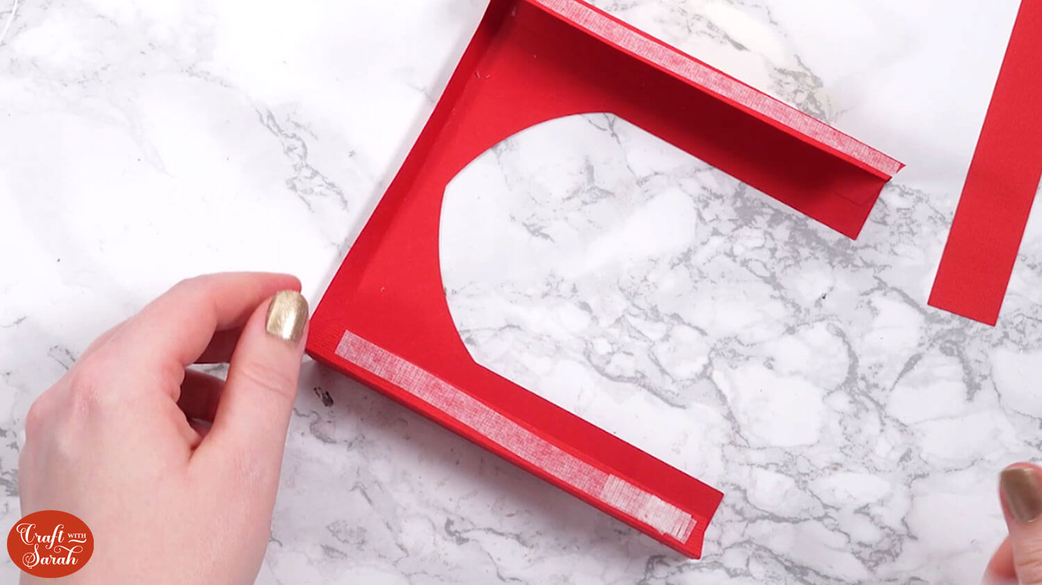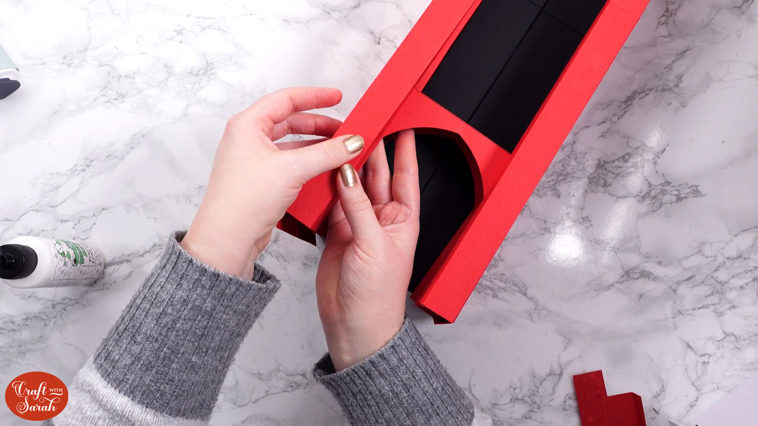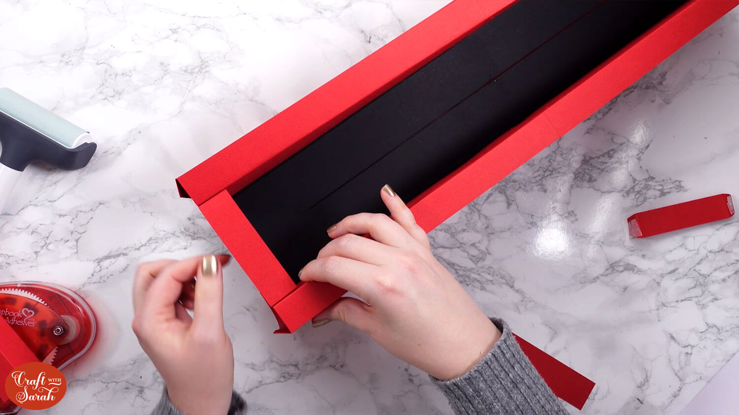 Use double-sided tape or glue to attach the “tab” end of the central section to the inside of the opposite side, to turn it into a box shape.