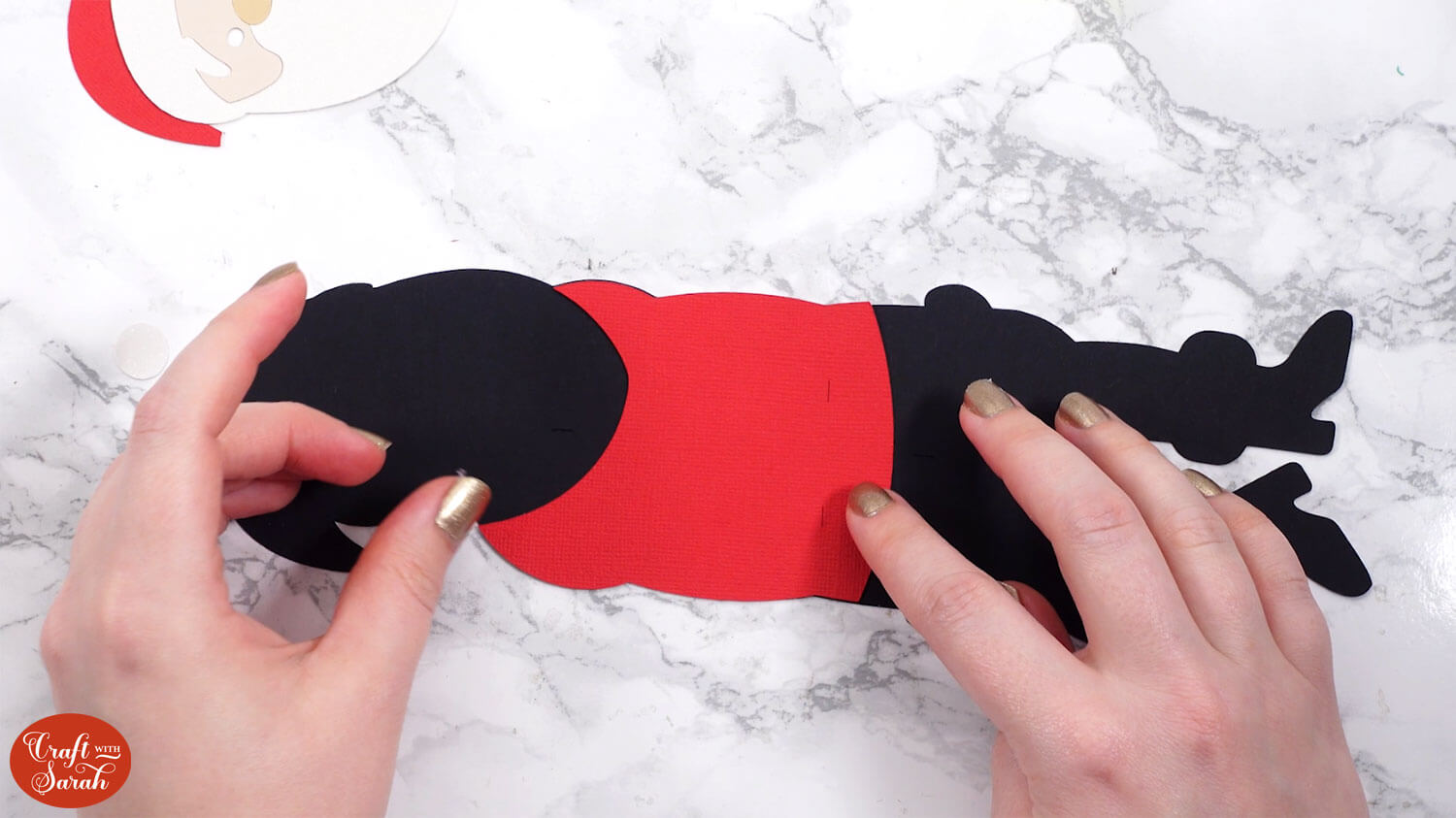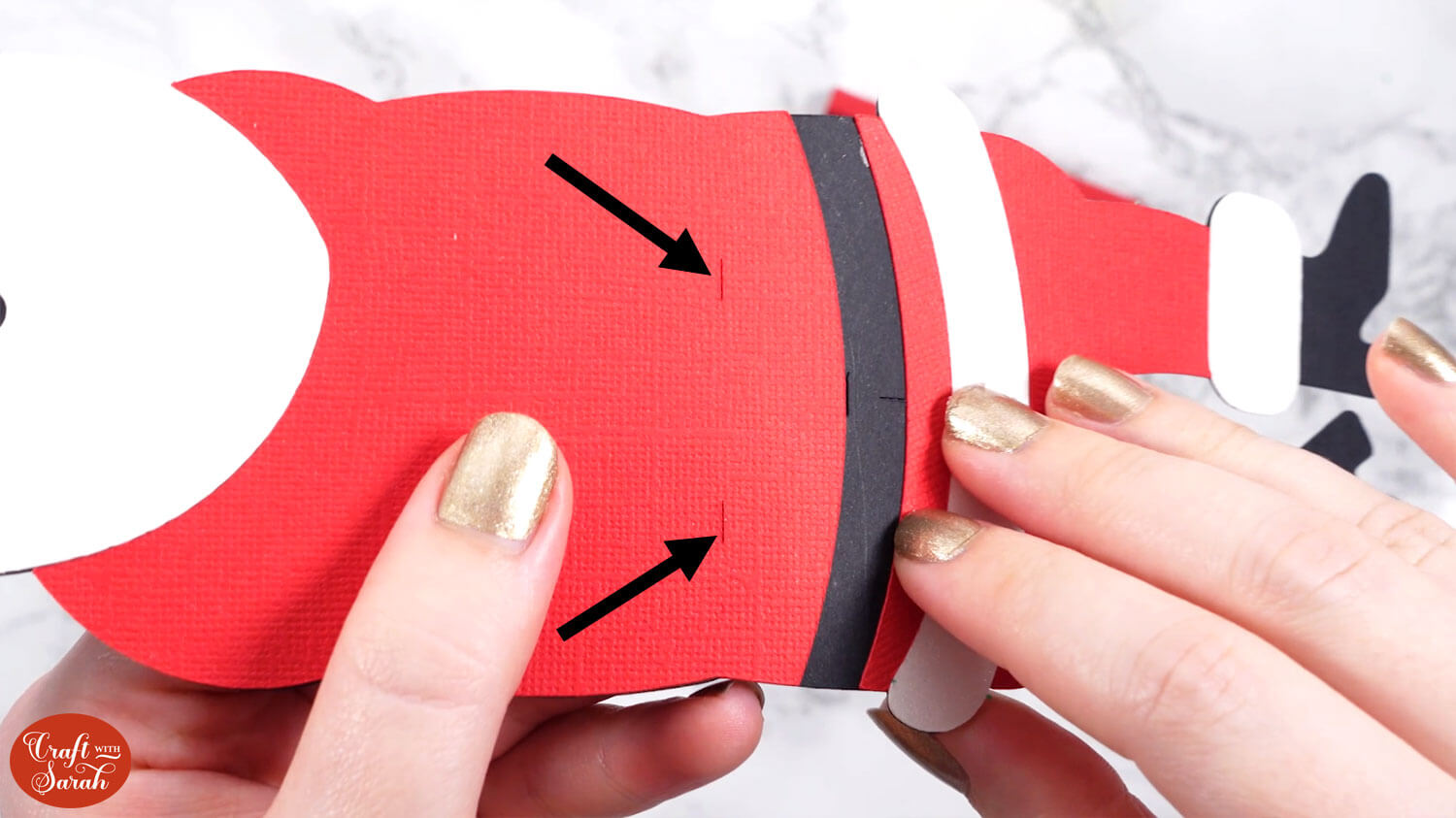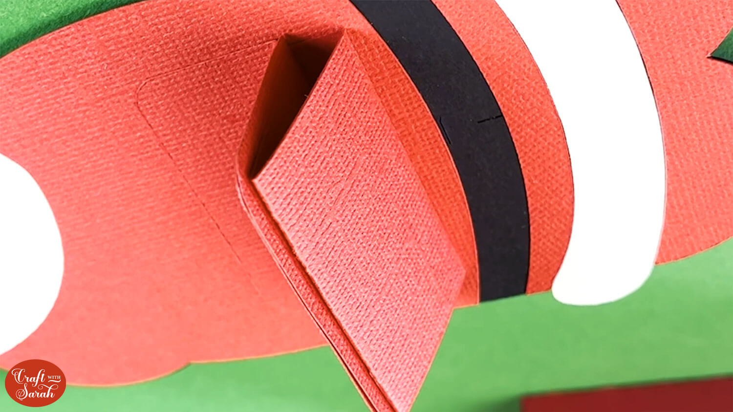 Glue this to the back of Santa, lining it up between the two small vertical cut lines in the black Santa piece.