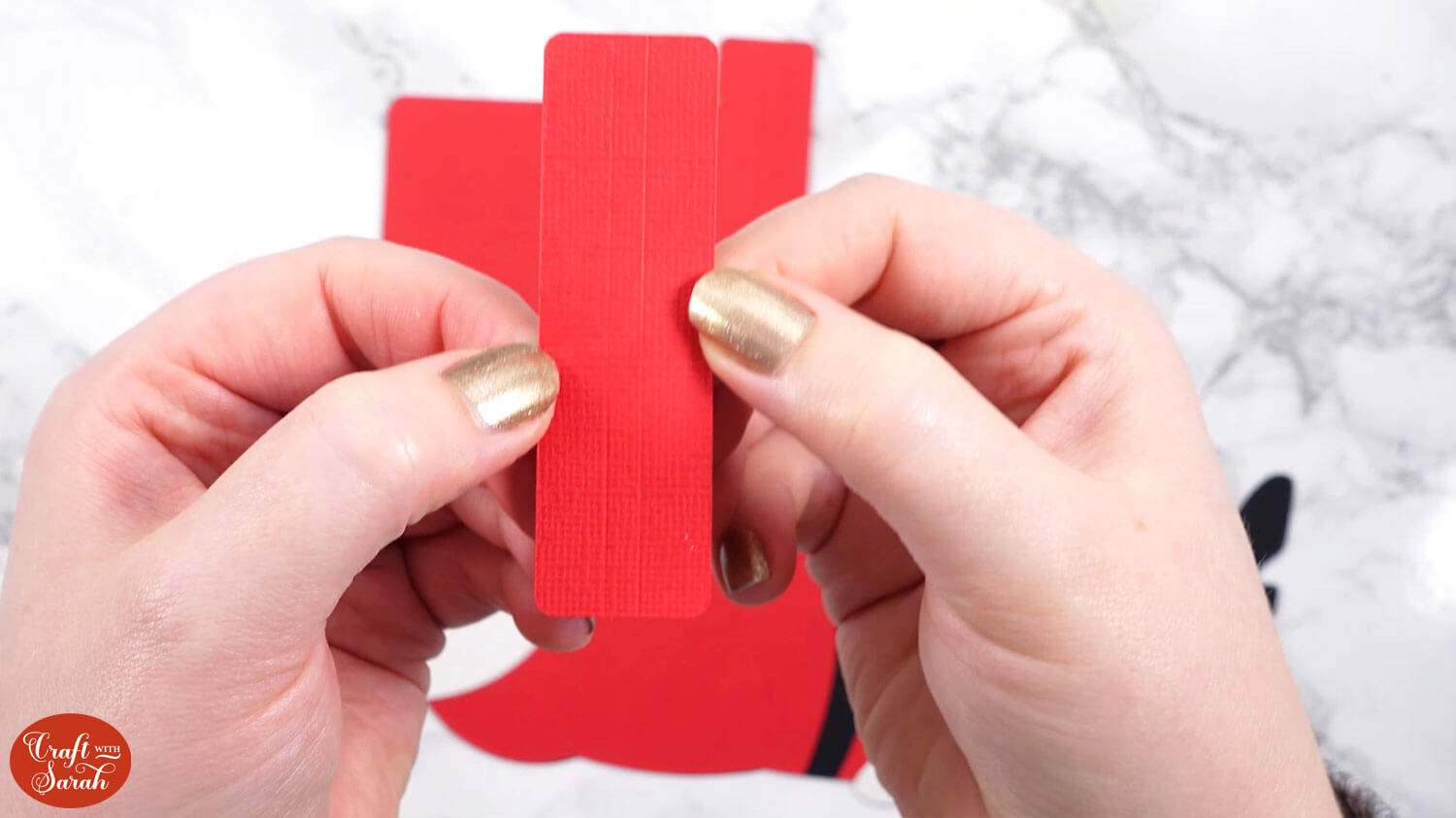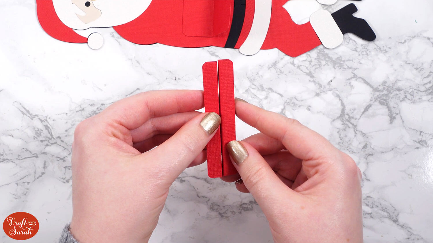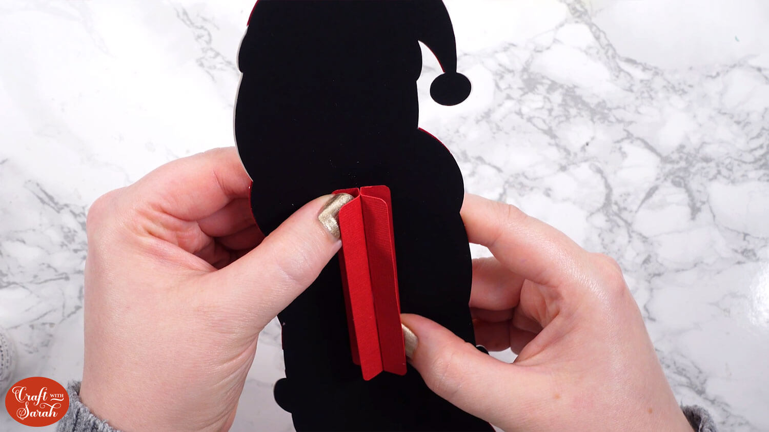 Glue this to the back of Santa, lining it up between the two small vertical cut lines in the black Santa piece.