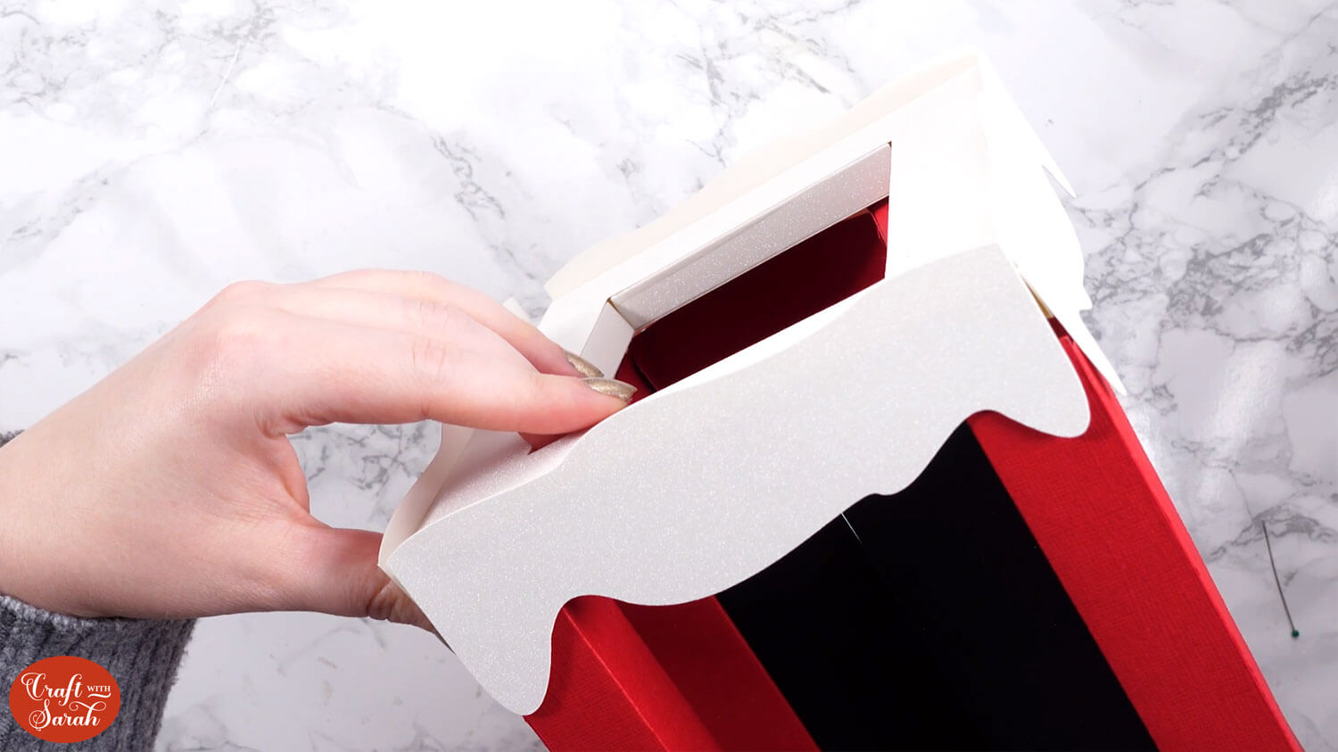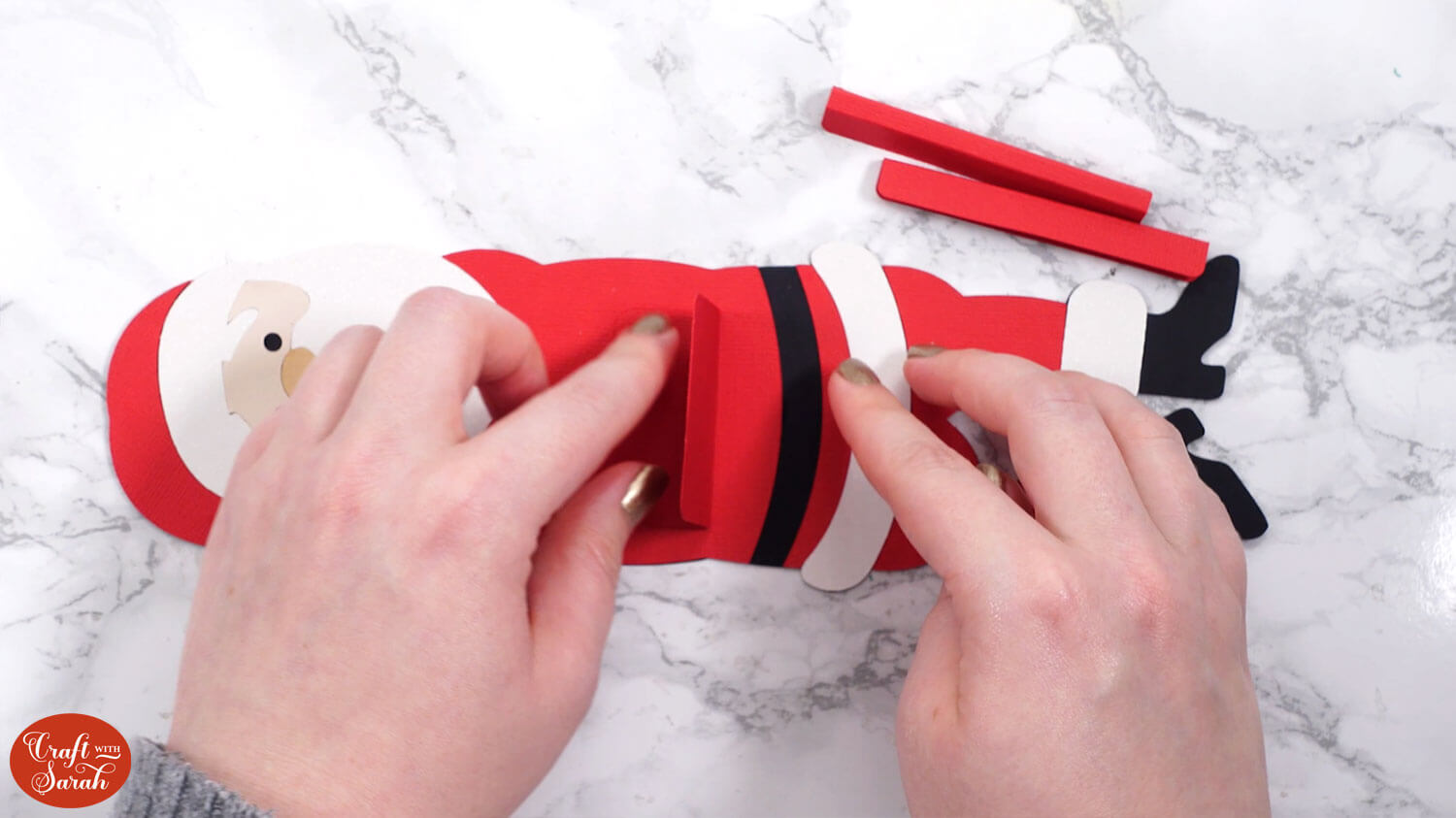 Glue this to the top of the “shelf” so that it is on the side of the shelf closest to Santa’s feet.