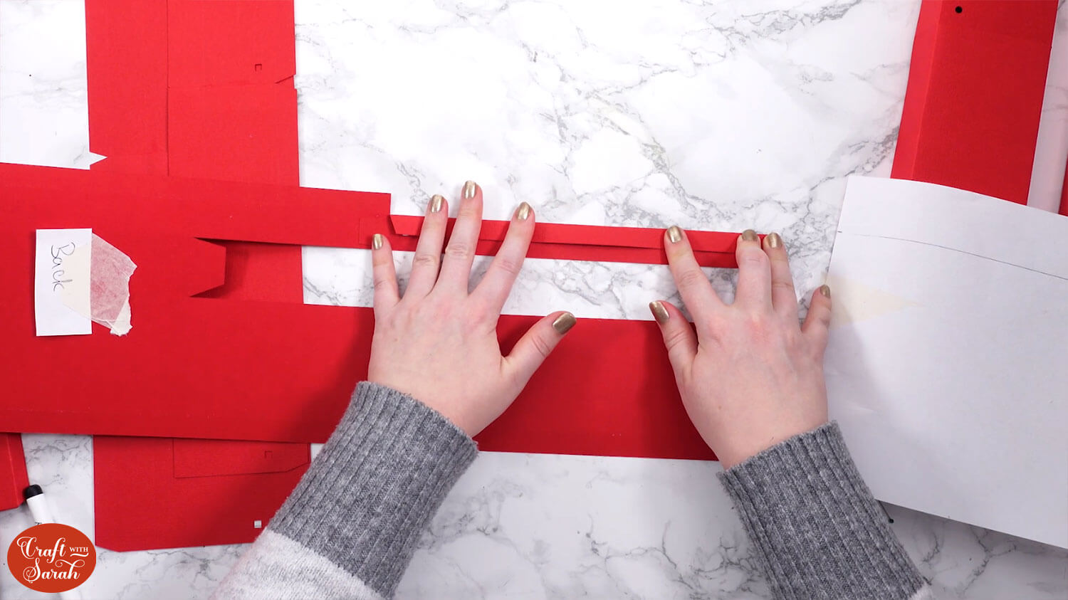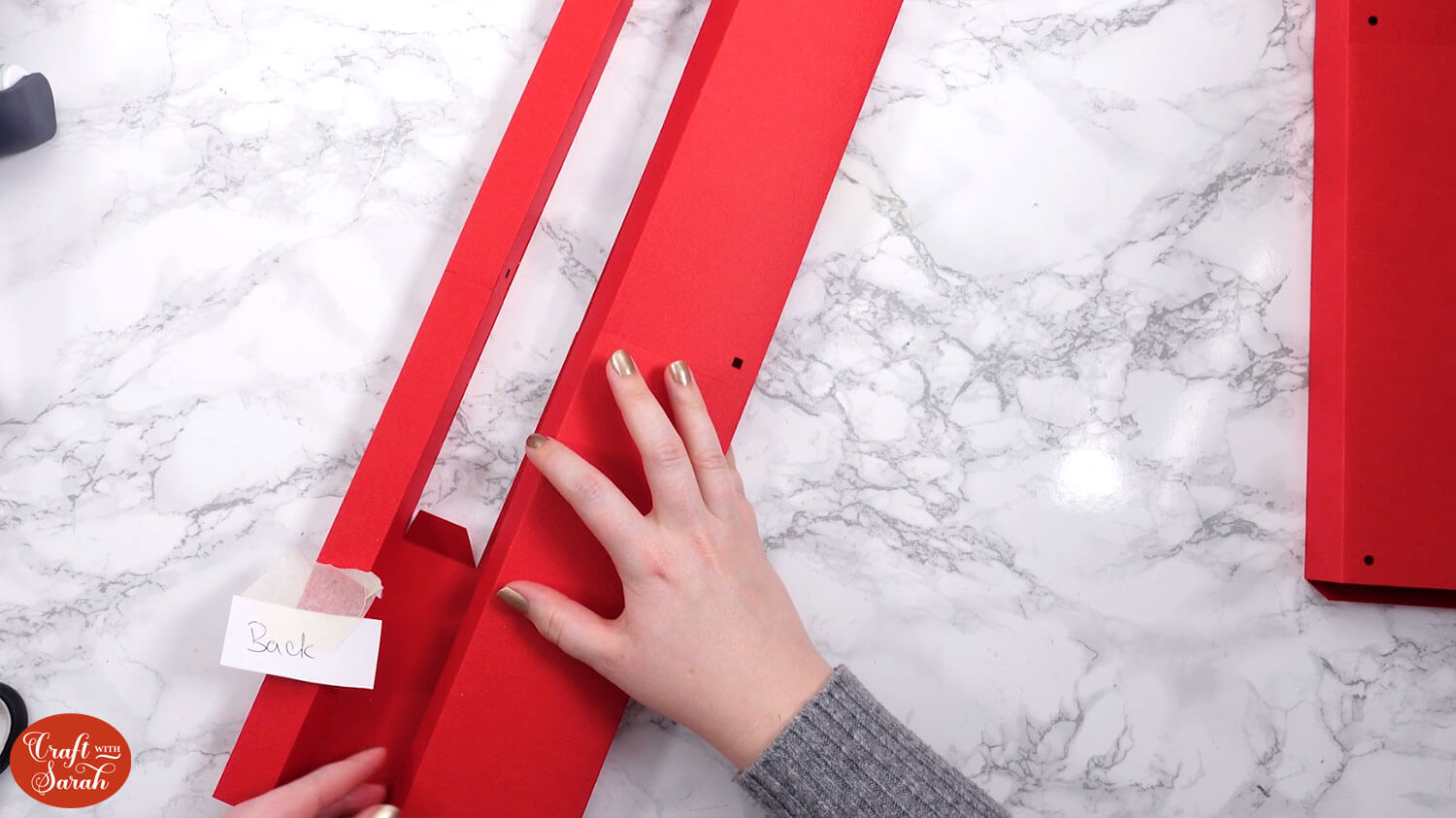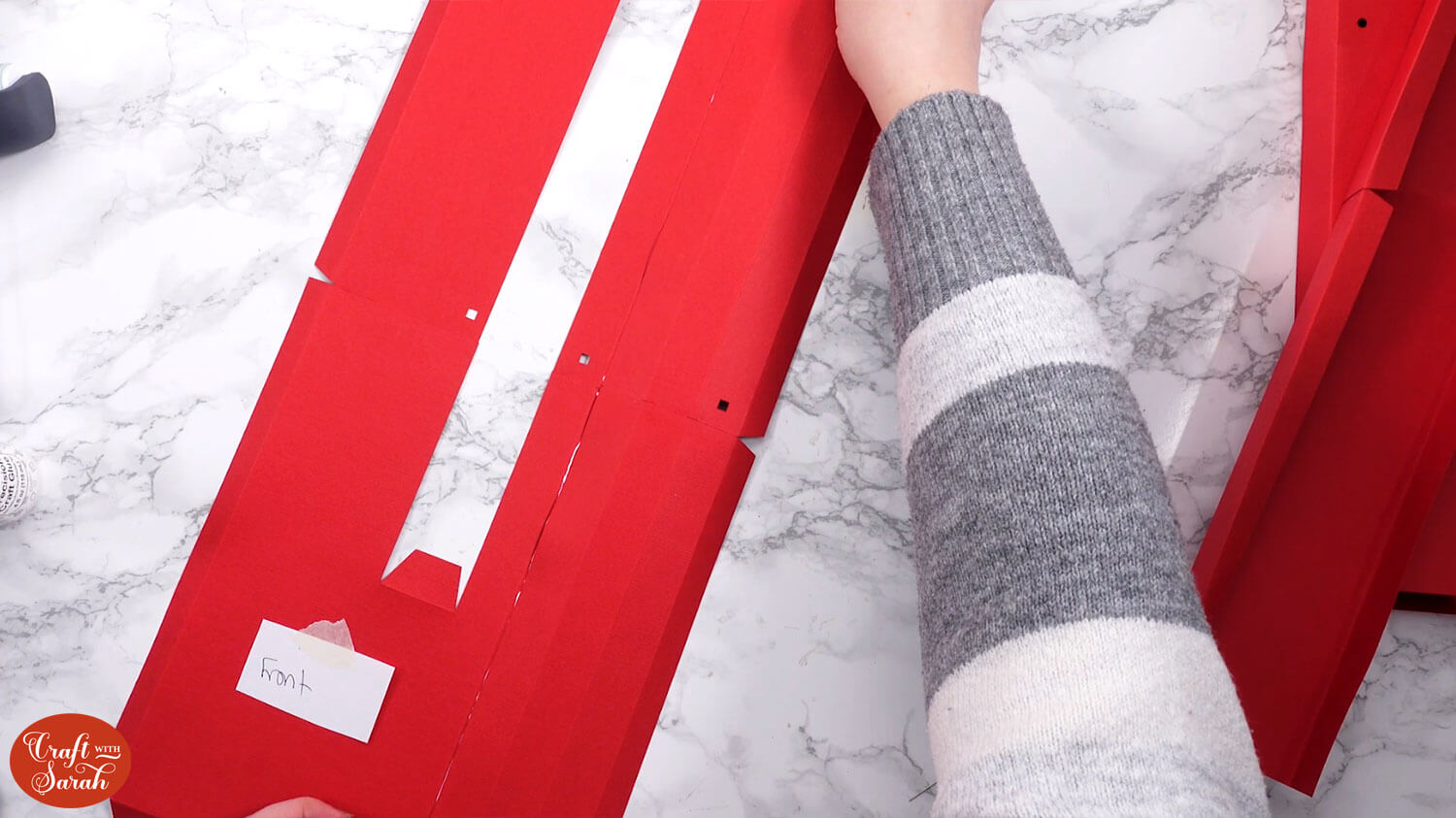 To make the next steps easier to see, I have stuck a “front” and “back” label on the main structural piece of the project so you can tell which way around it is facing at each point. You may wish to do similar for your project.