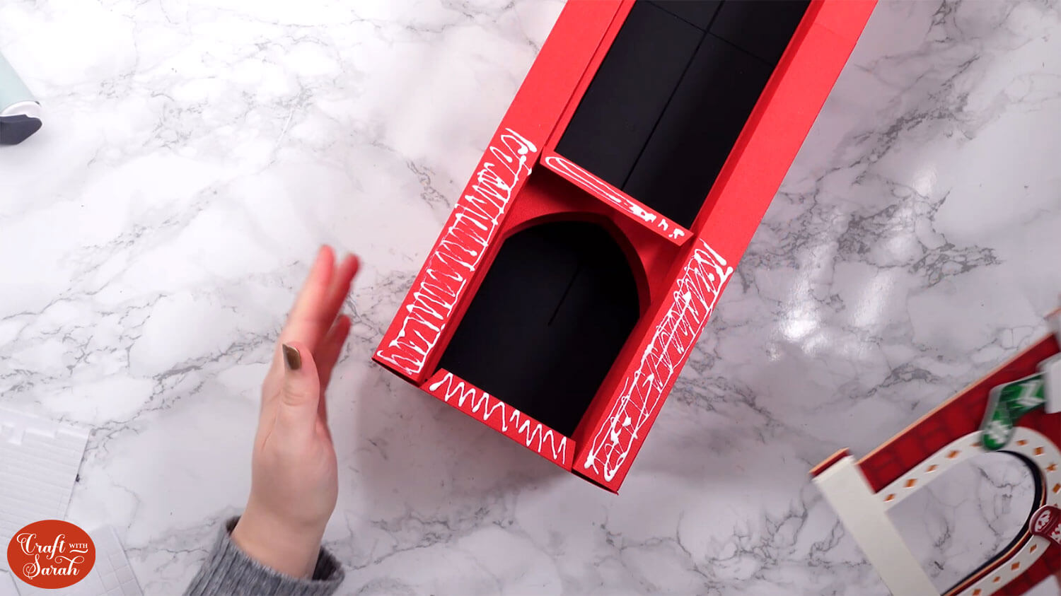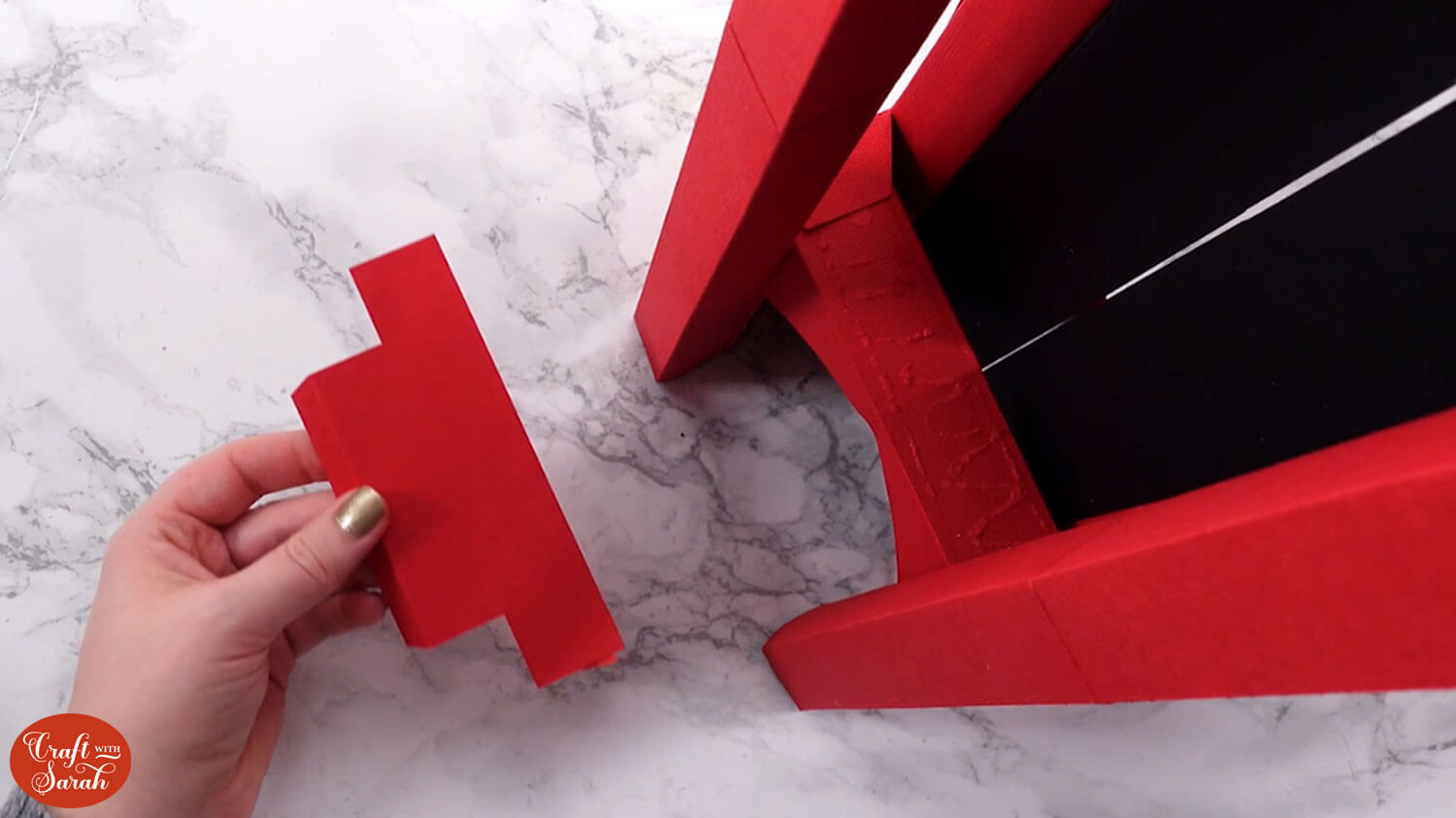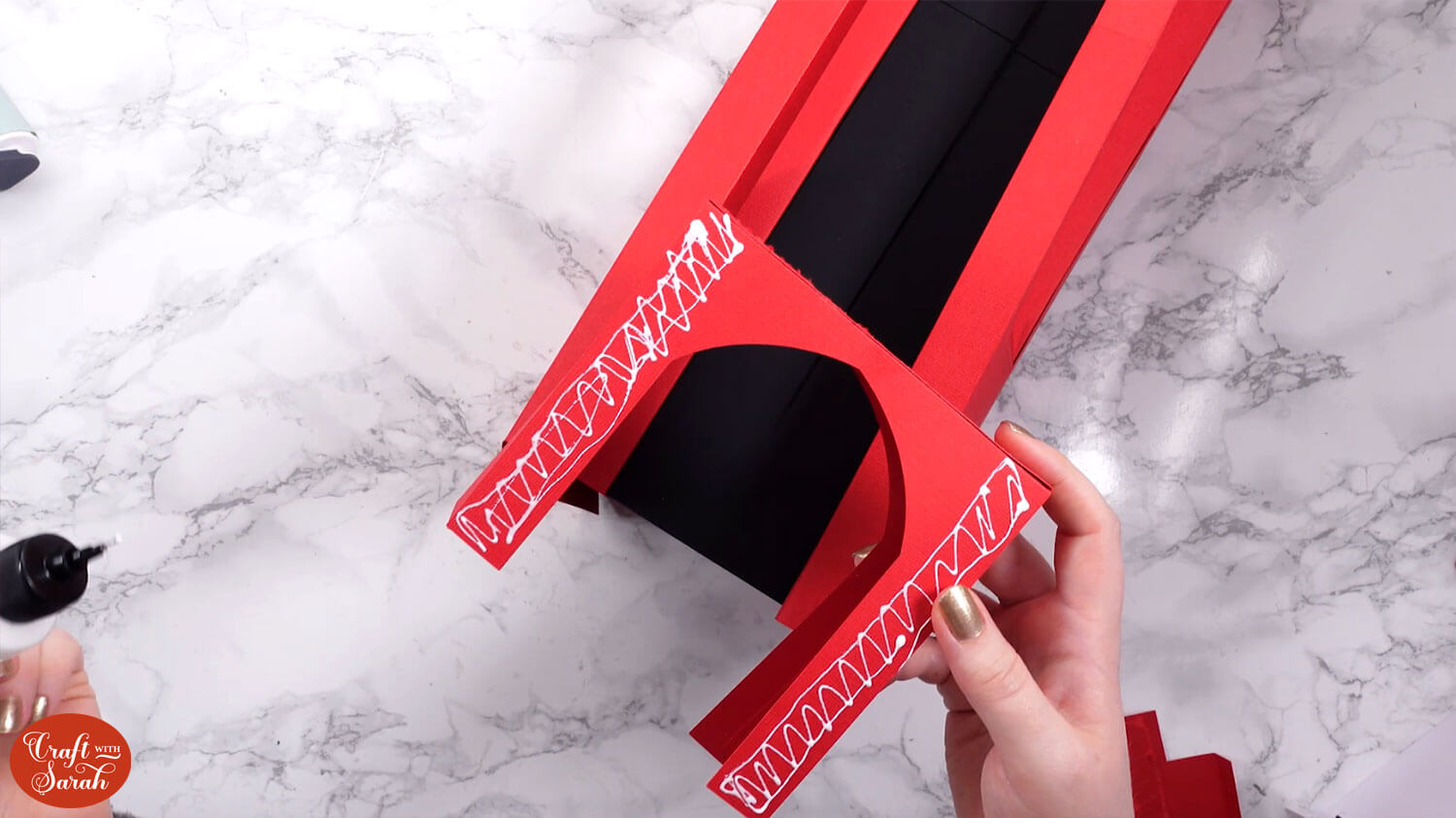 Glue the second black piece on top of the tabs. It’s important to get it stuck the correct way, as if the tabs are in front then they will cause Santa to “jam” as he is sliding down the chimney.