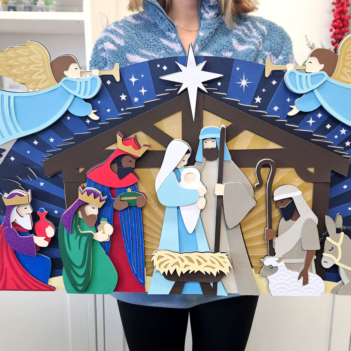 This incredible giant Nativity sign measures a whopping 28 inches wide! What I especially love about this giant sign design is that all the Nativity characters are made as their own stand-alone layered designs, so you can use them on other projects such as greetings cards and shadow boxes too.