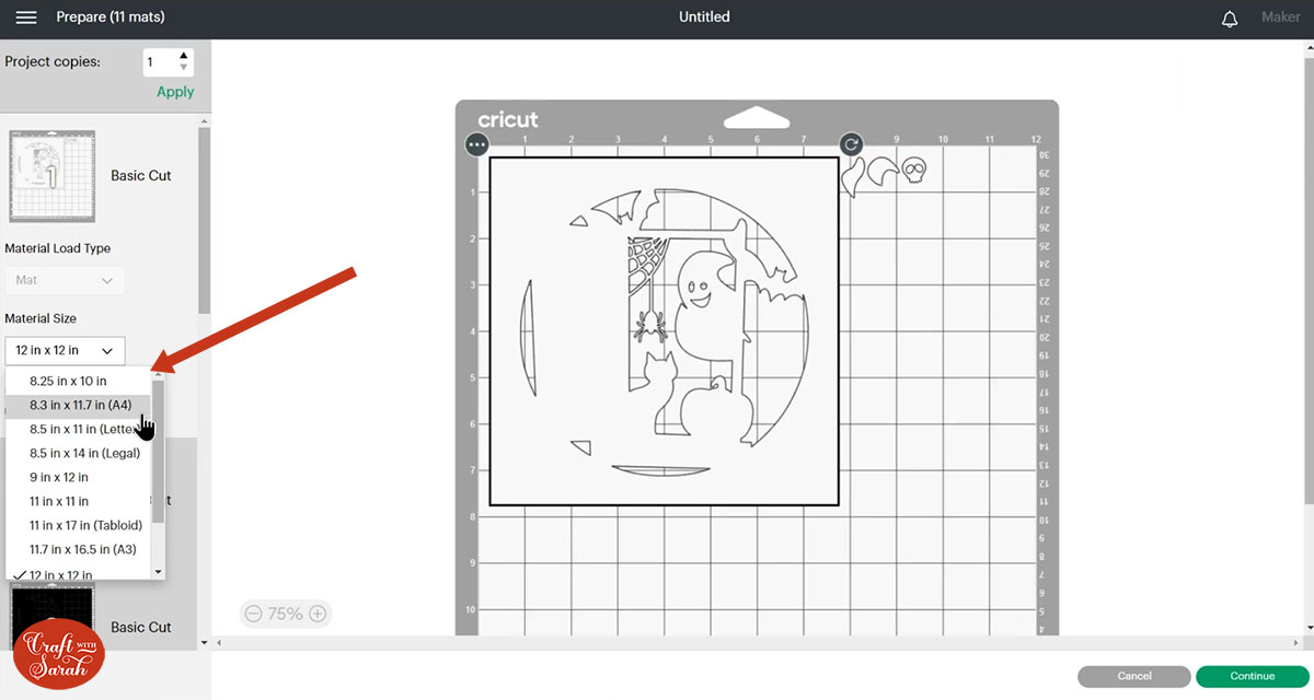 Click the design on your canvas and use the width/height boxes near the top of the screen to make it the size that you want to cut it.