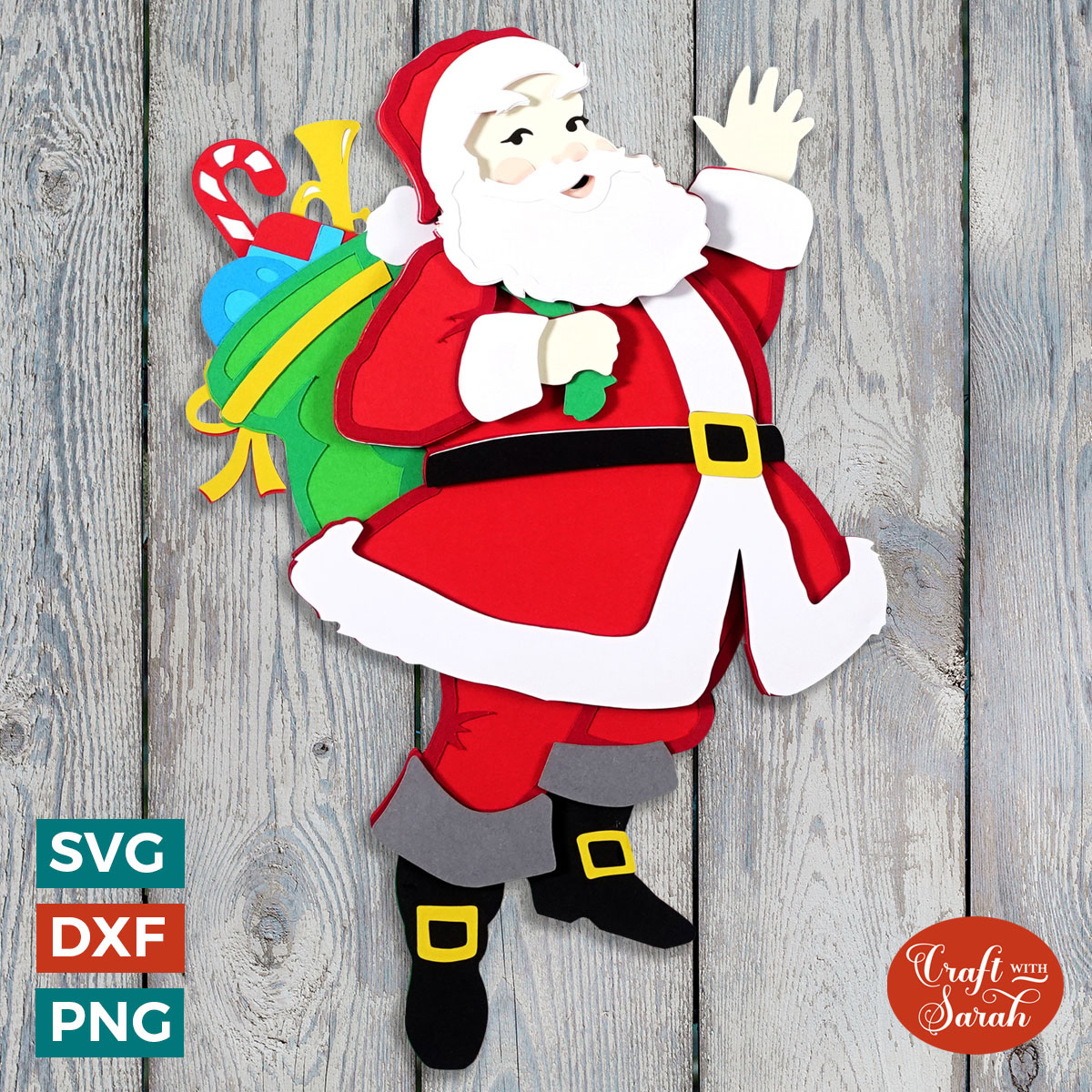 This traditional Santa layered papercraft is waving his hand to say “hello” as he delivers his sack full of gifts.