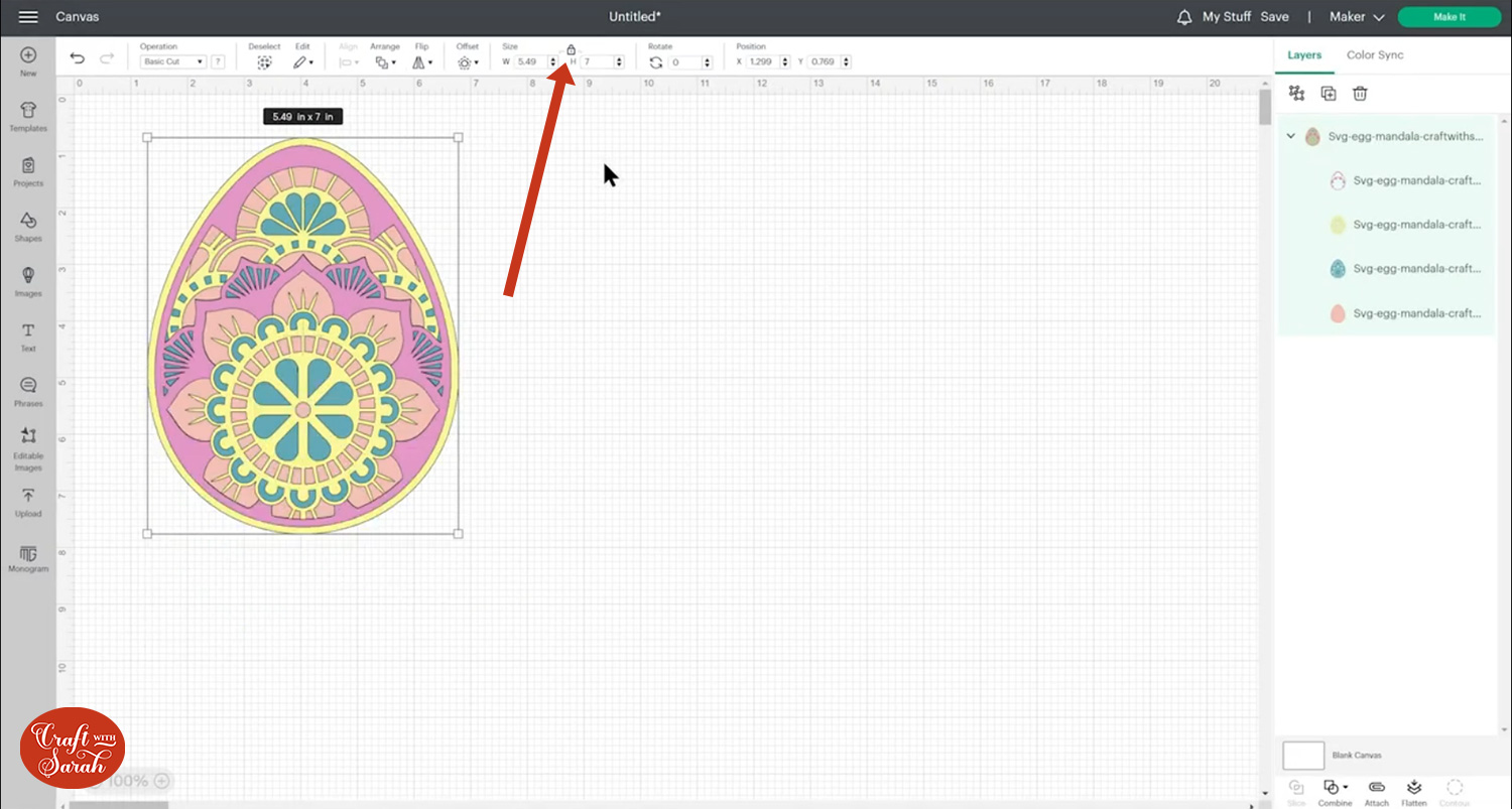 Click the design on your canvas and use the width/height boxes near the top of the screen to make it the size that you want to cut it.