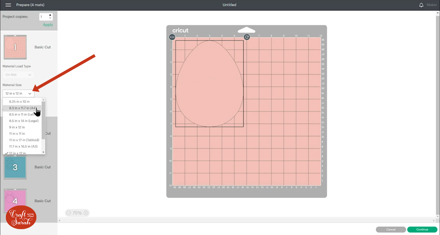To change the paper size, go into the dropdowns over on the left side of the screen and choose the paper size that you want to use. You need to change it for every single colour.