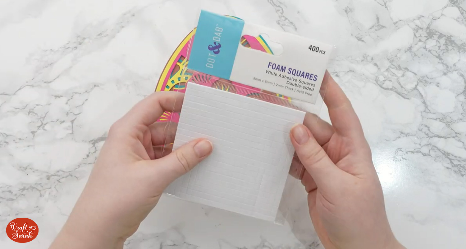 The foam pads that I use are from “Dot & Dab”, but any foam squares will work. If yours are big then you may need to cut them smaller with scissors to fit inside the edges of the layers.