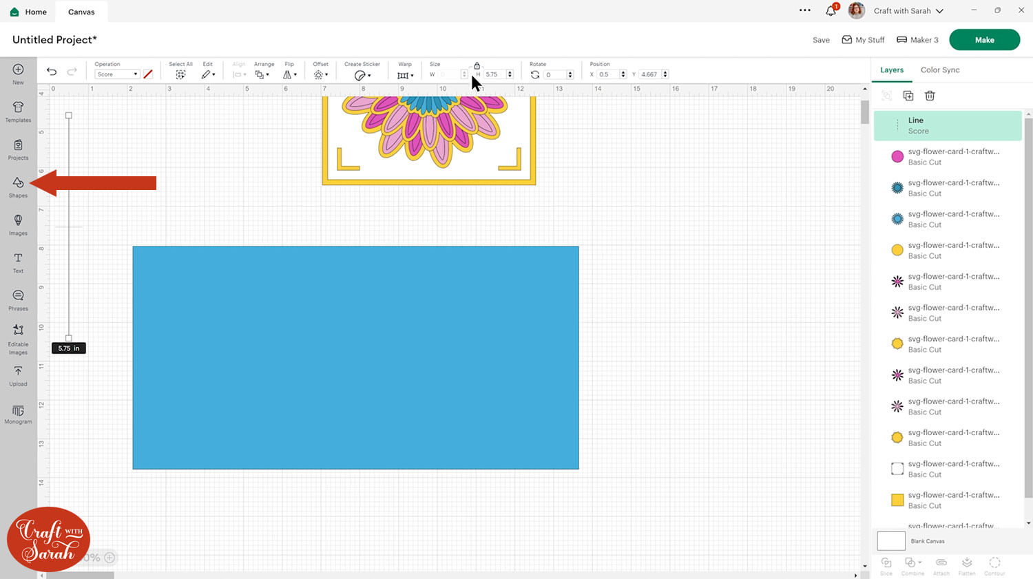 Click “Shapes” and insert a Score Line. Make it 5.75 inches tall.