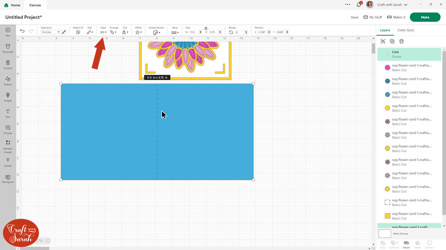 Select the score line and the base card, then click “Align” and “Center” to put the score line exactly in the middle of the card.