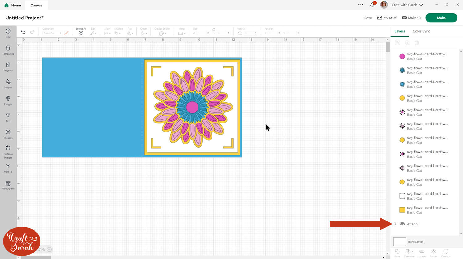Attach is what tells the Cricut that we want it to do the score line down the middle of the base card.