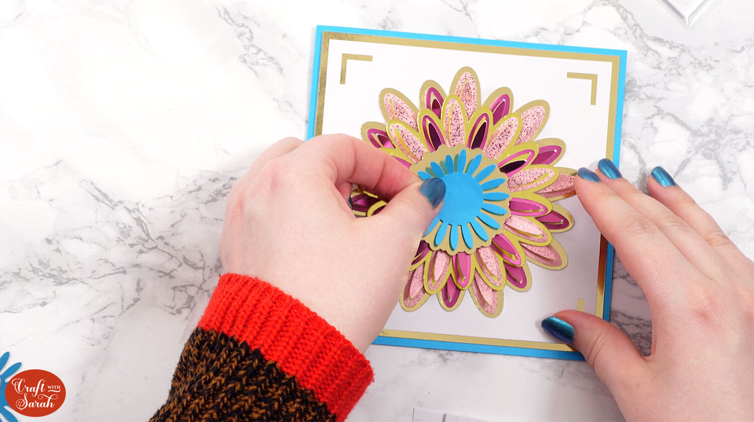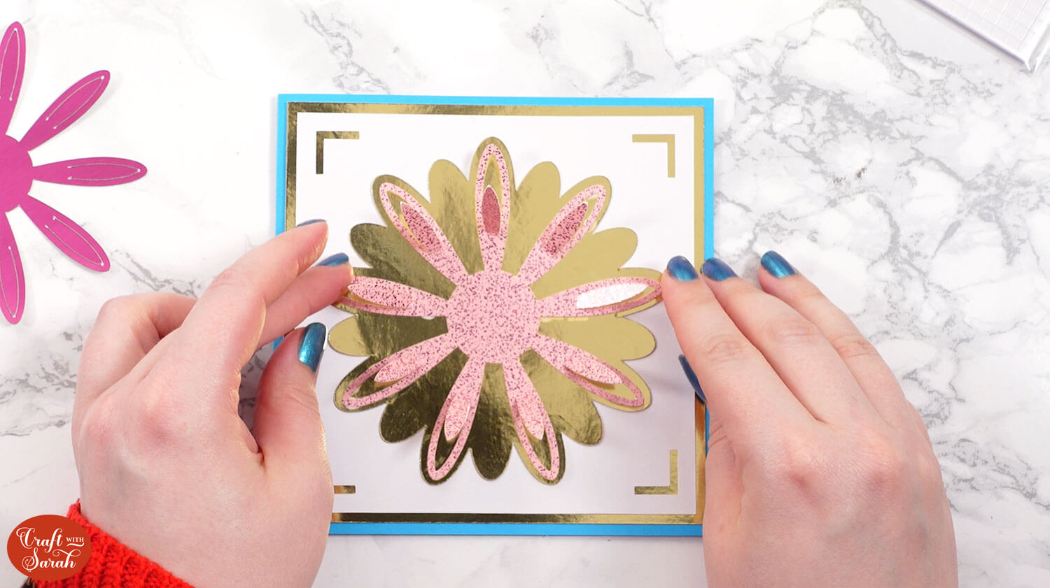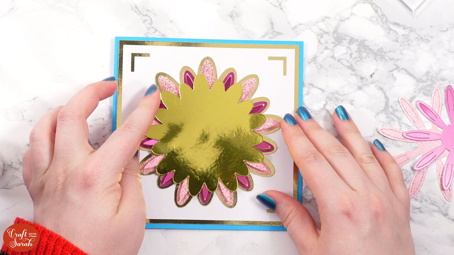 Fold out the edges of the petals on the matching flower pieces, then glue them to the card, one at a time.