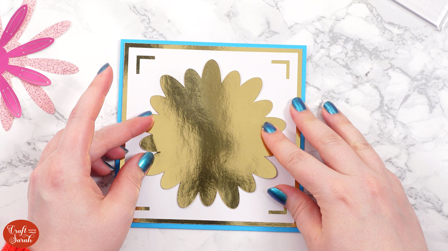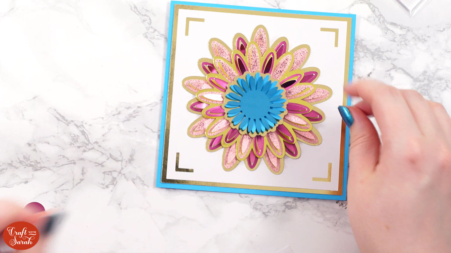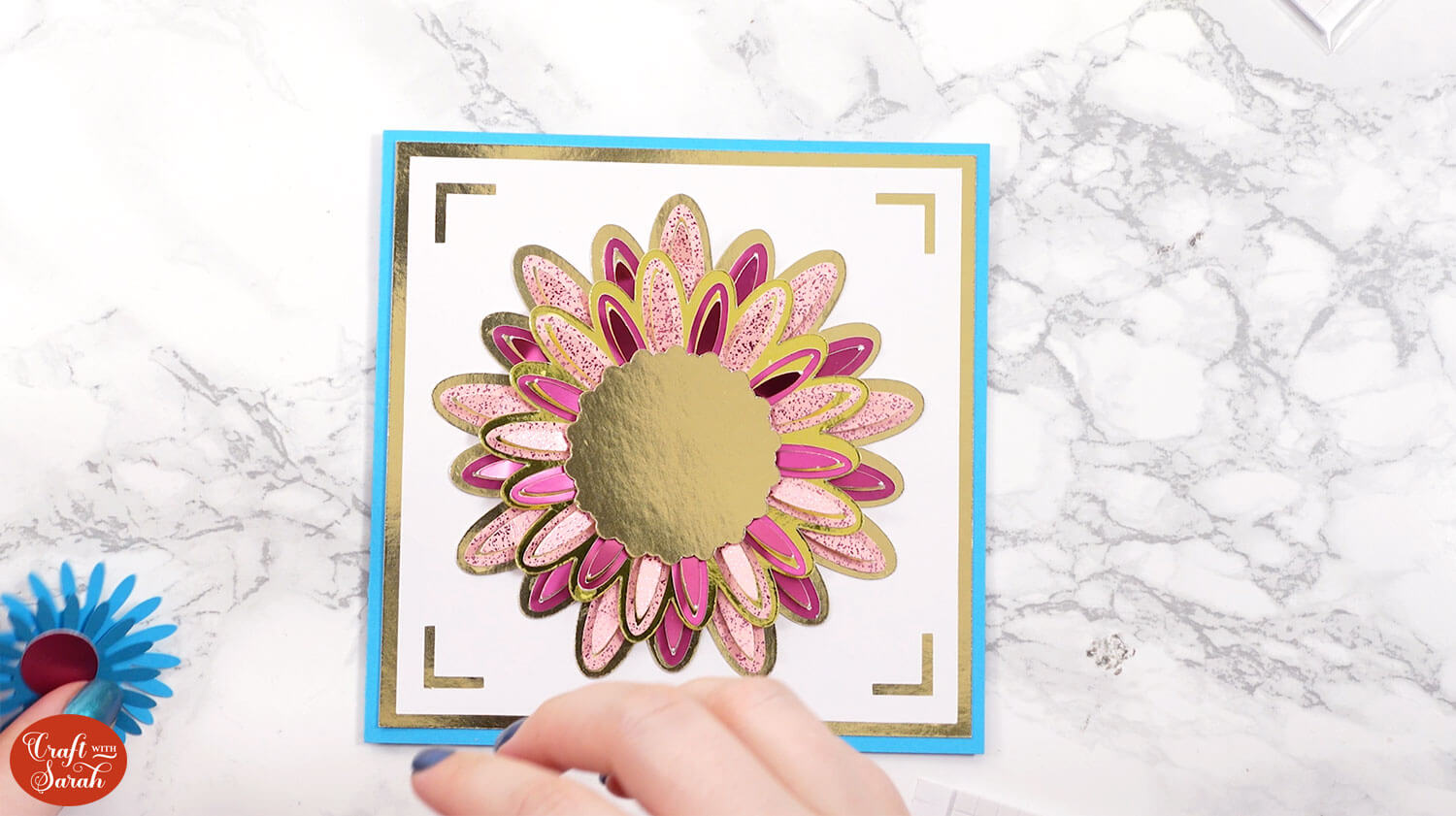 Fold out the edges of the petals on the matching flower pieces, then glue them to the card, one at a time.