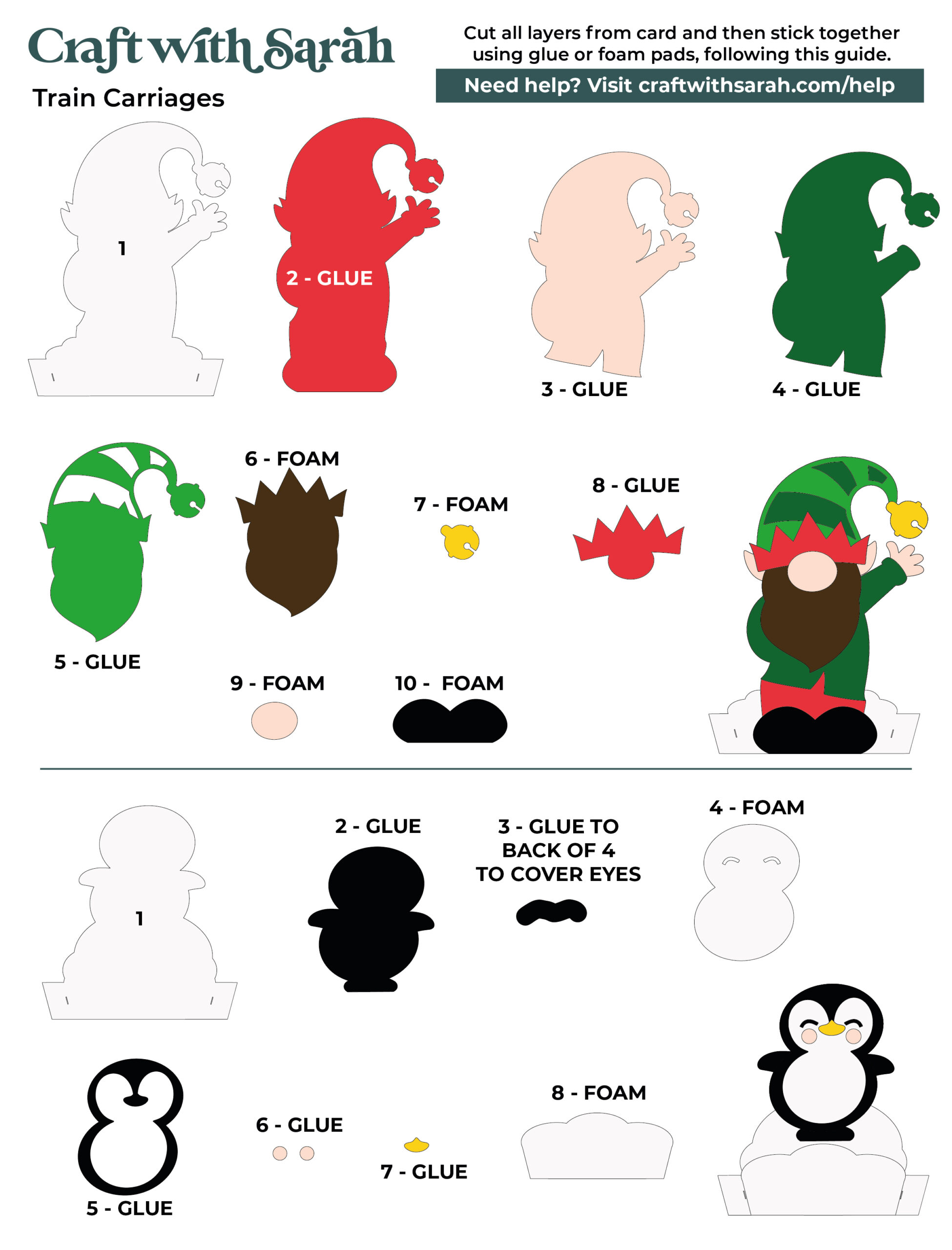 You’ll be working with layered cardstock pieces, simple folds and tabs to bring this Christmas train to life. Plus, it’s easy to personalise by switching up the cardstock colours or adding your own embellishments.