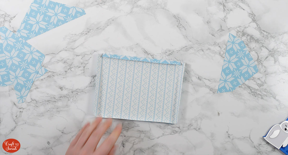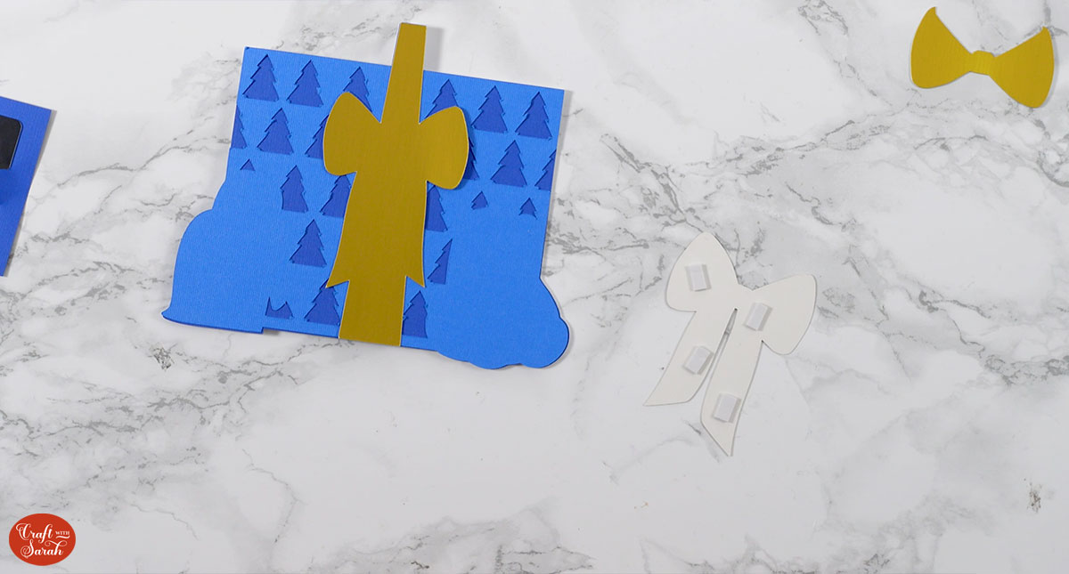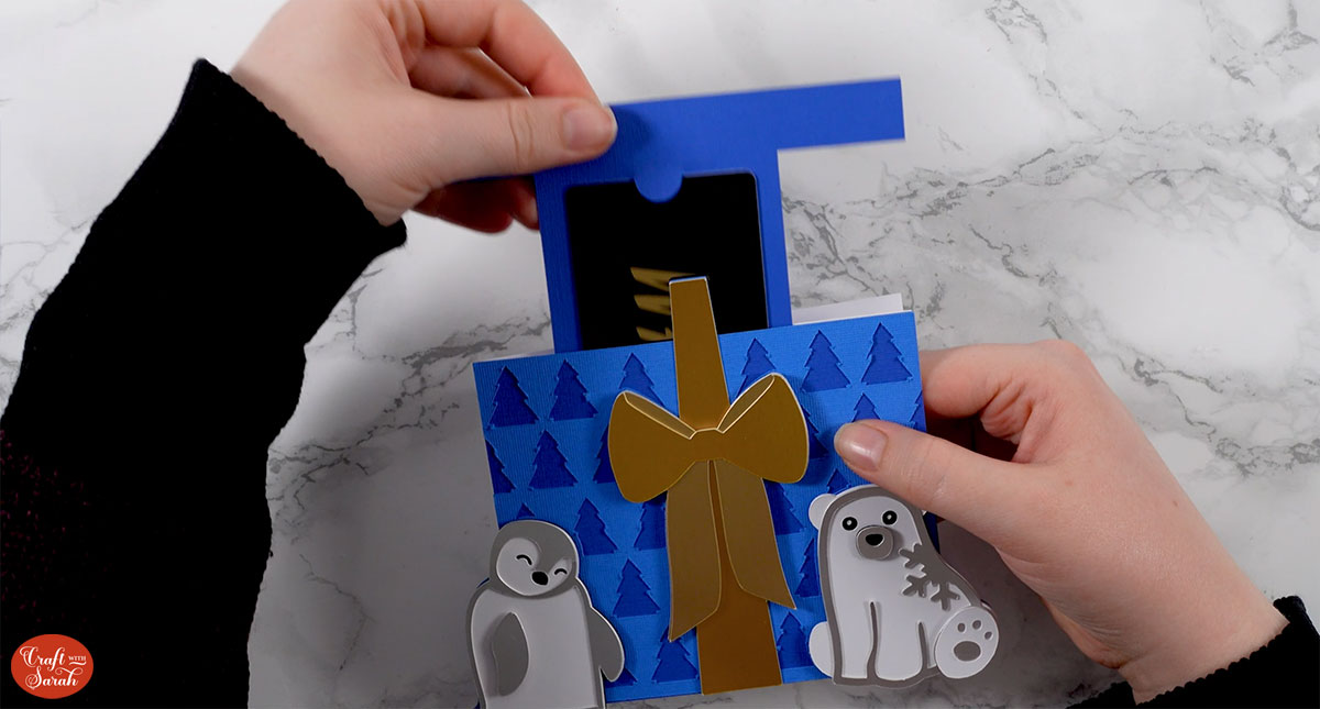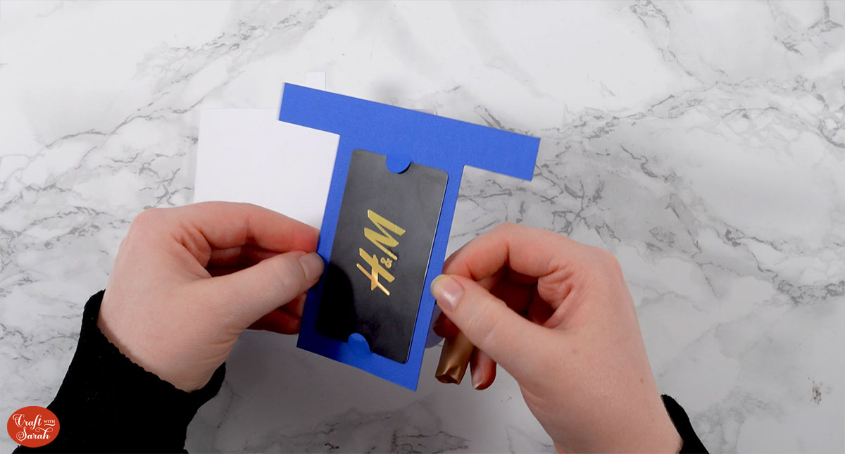 Once all your layers are stuck together, wait for the glue to dry completely and then slot the gift card piece in between the card base and the front of the gift present.
