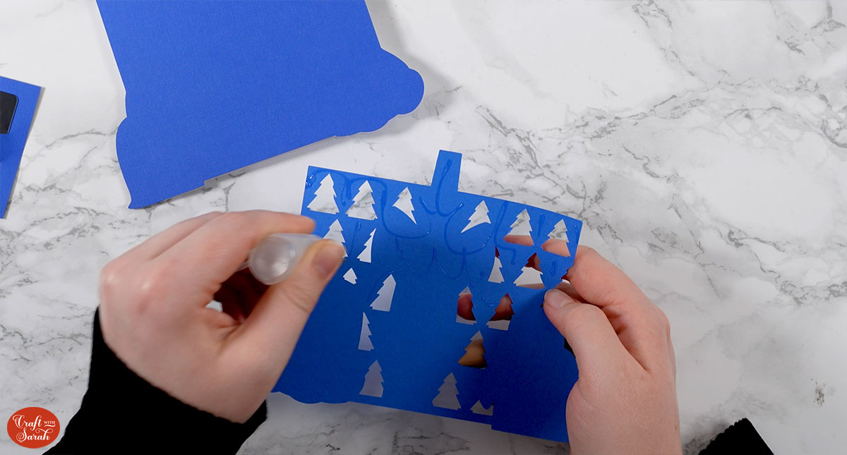 I made mine red for cutting it out so I could cut it from a different colour to the dark blue as the base card needs 12×12 inch card due to its size. I don’t have any 12z12 in blue so I’m going to cut it from white instead.