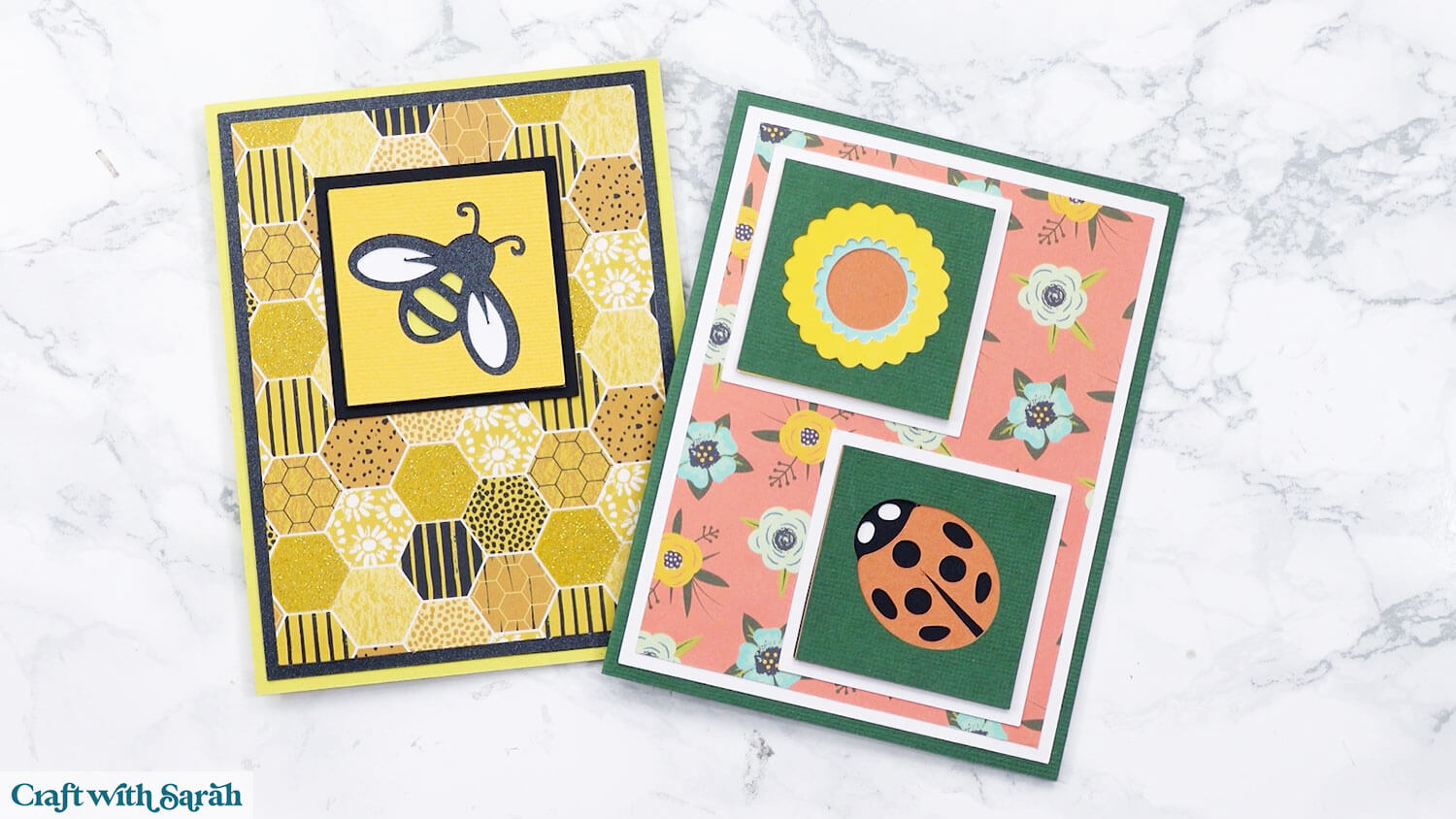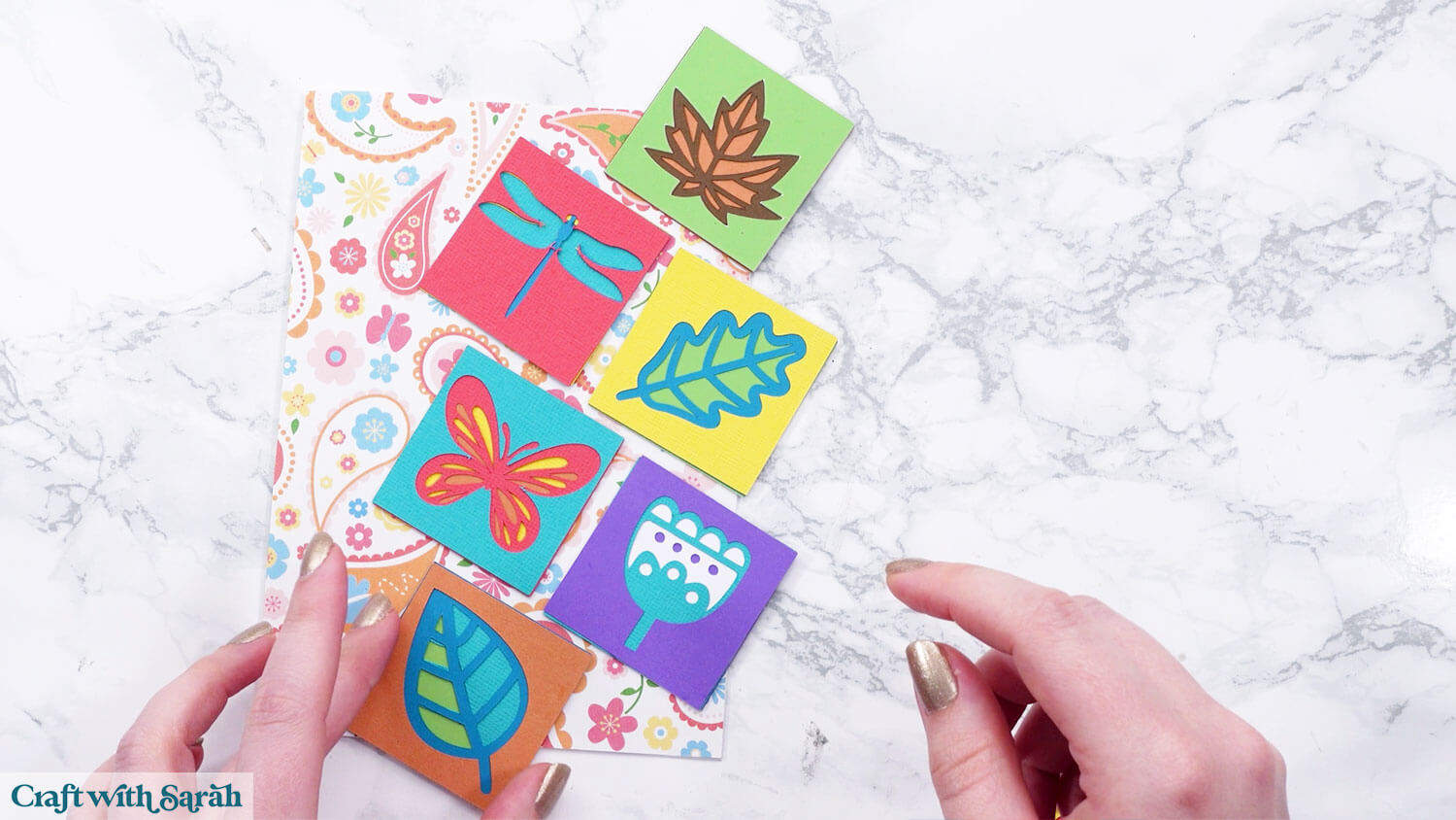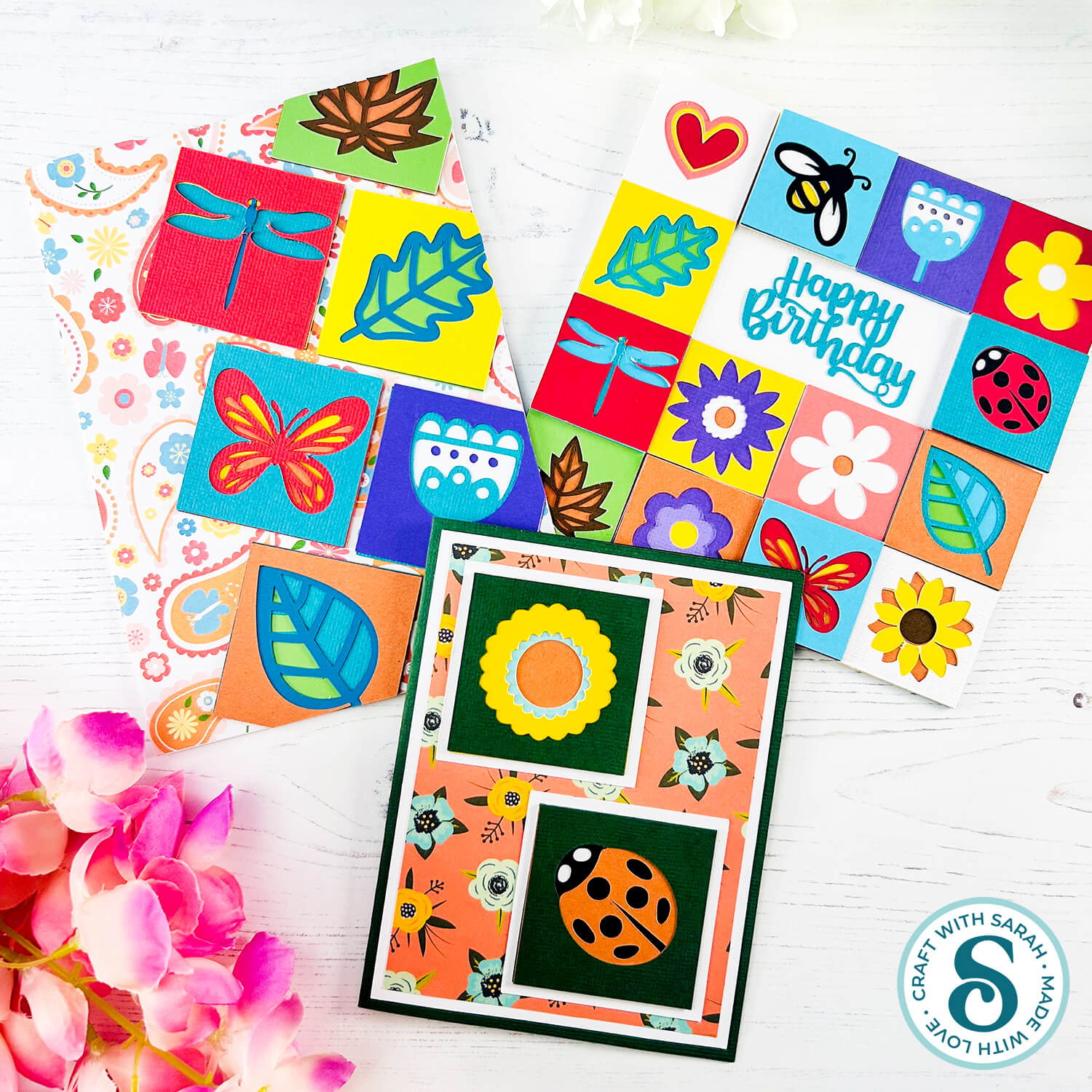 These Block Builder cards are made up of little square designs layered with cardstock to create flowers, leaves, insects, and more. Each square is made from three or four layers, and you can mix and match them however you like.