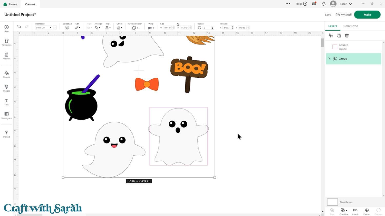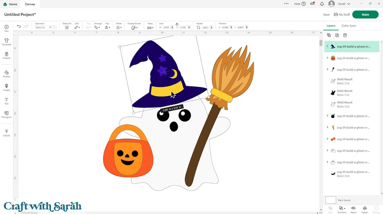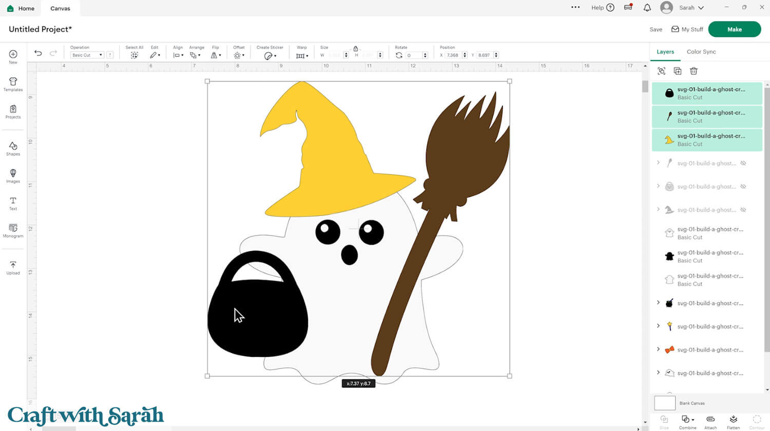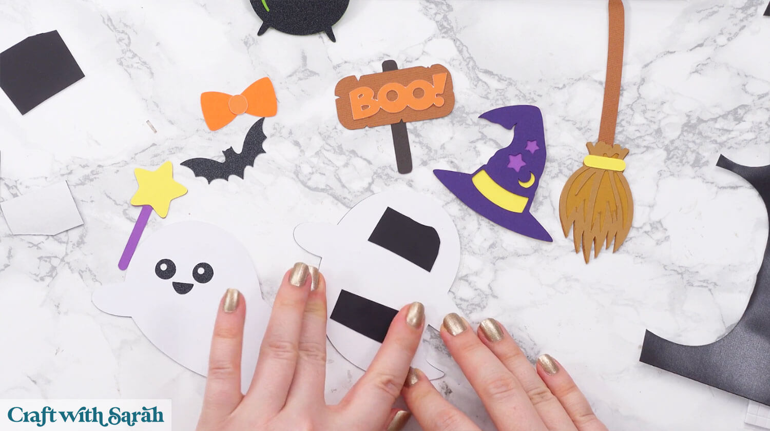 In Cricut Design Space, you can arrange the accessories however you like. Add a hat, broom, pumpkin, or bow tie—whatever fits your ghost’s personality.
