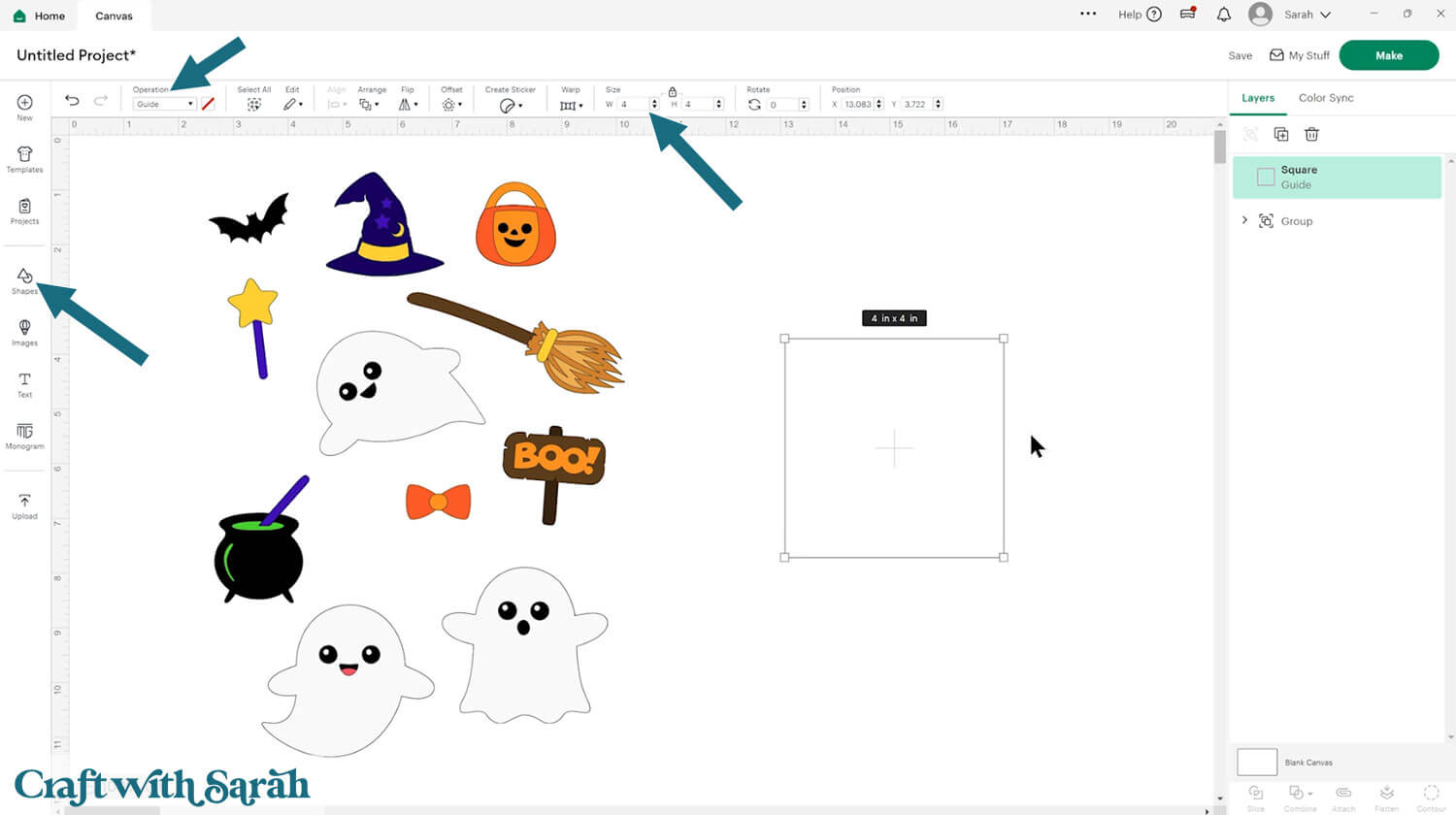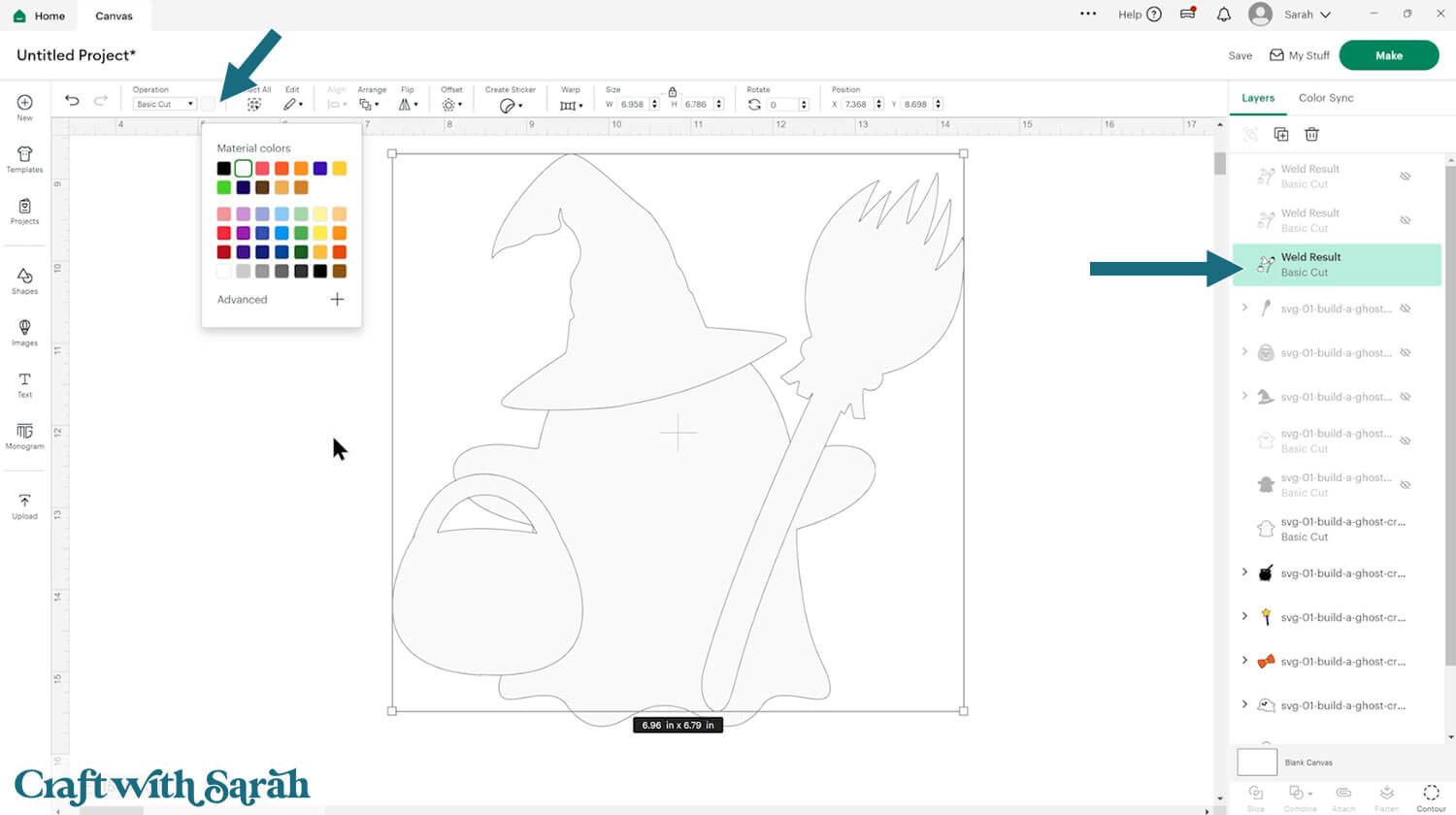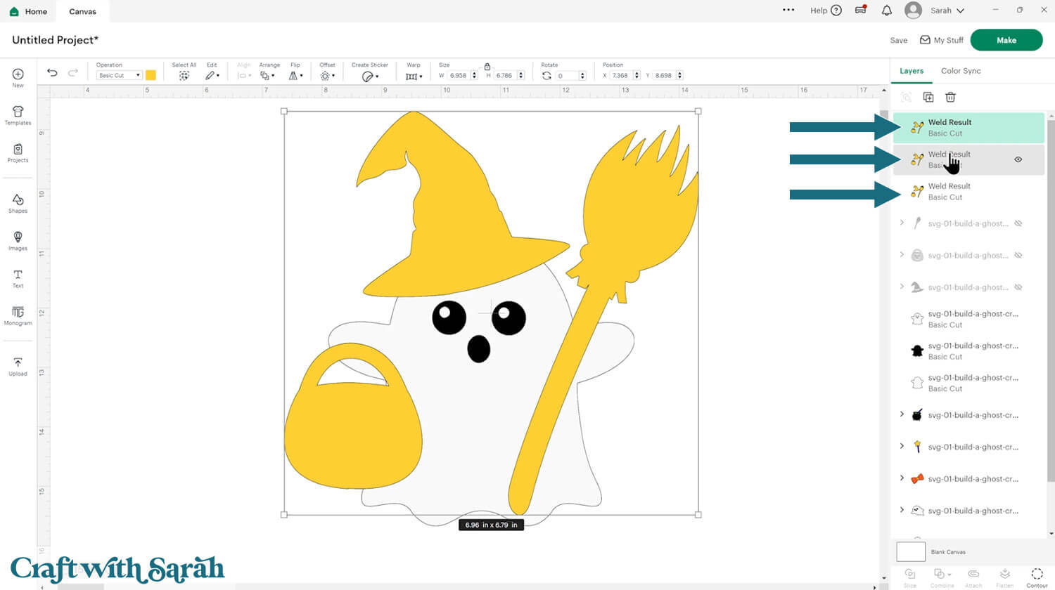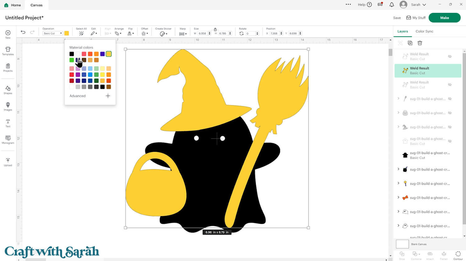 In Cricut Design Space, you can arrange the accessories however you like. Add a hat, broom, pumpkin, or bow tie—whatever fits your ghost’s personality.