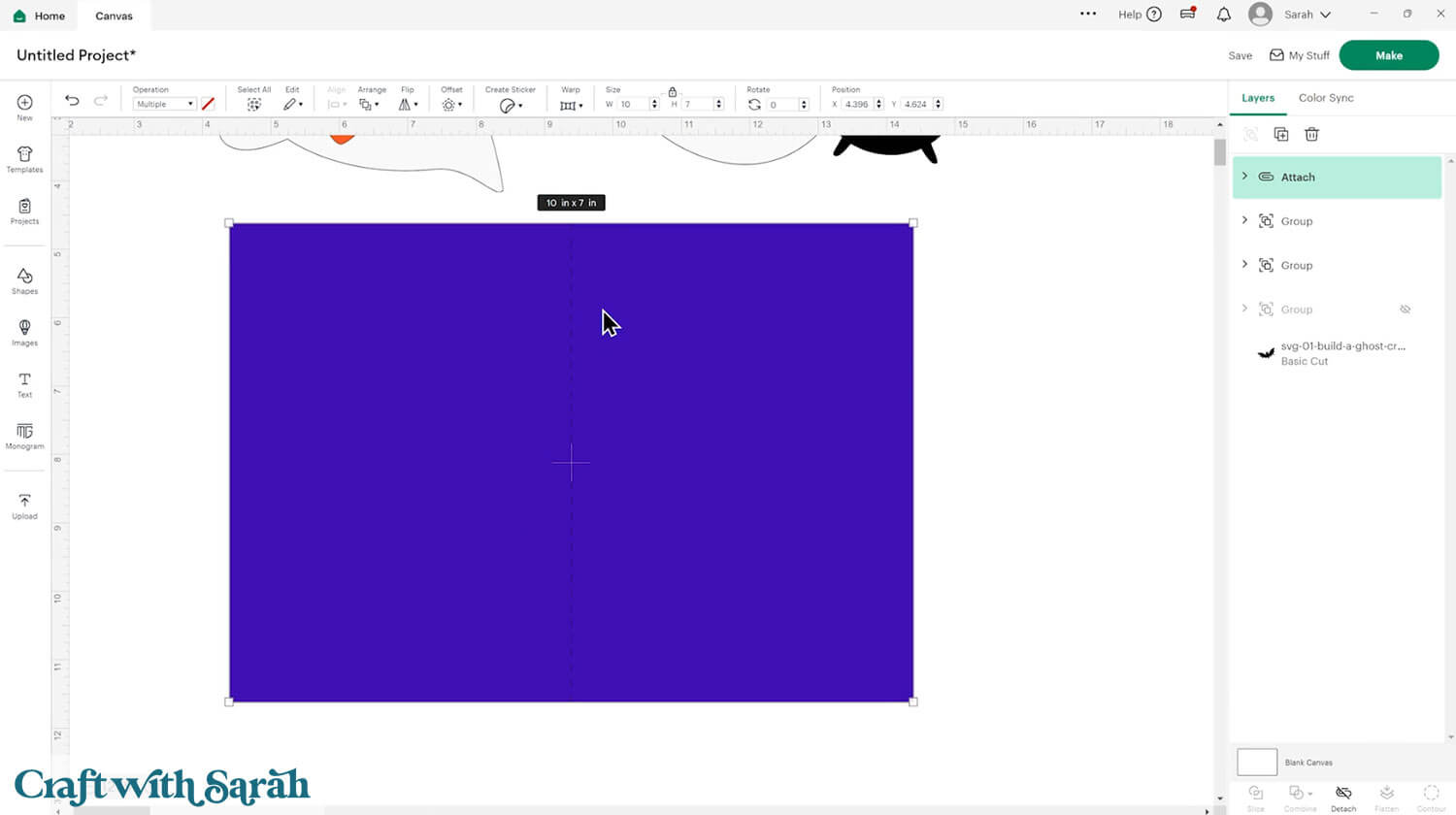 With both of those layers still selected, click the “Attach” button at the bottom of the layers panel. This tells the Cricut that we want it to do the scoring on the base card.