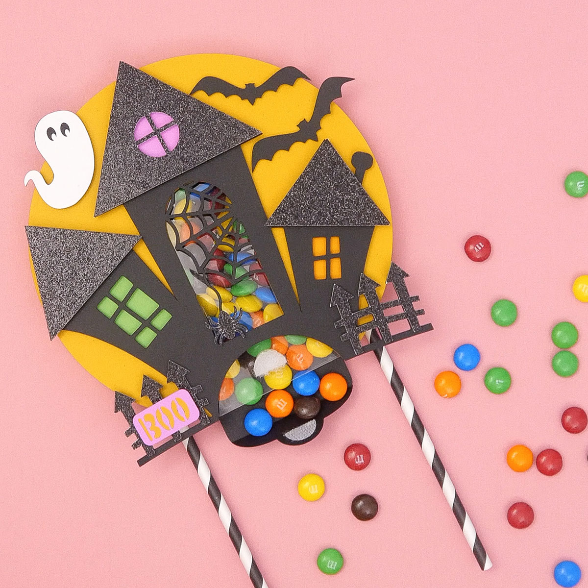 Follow Tara’s step-by-step instructions to make a layered papercraft haunted house cake topper, filled with M&Ms.