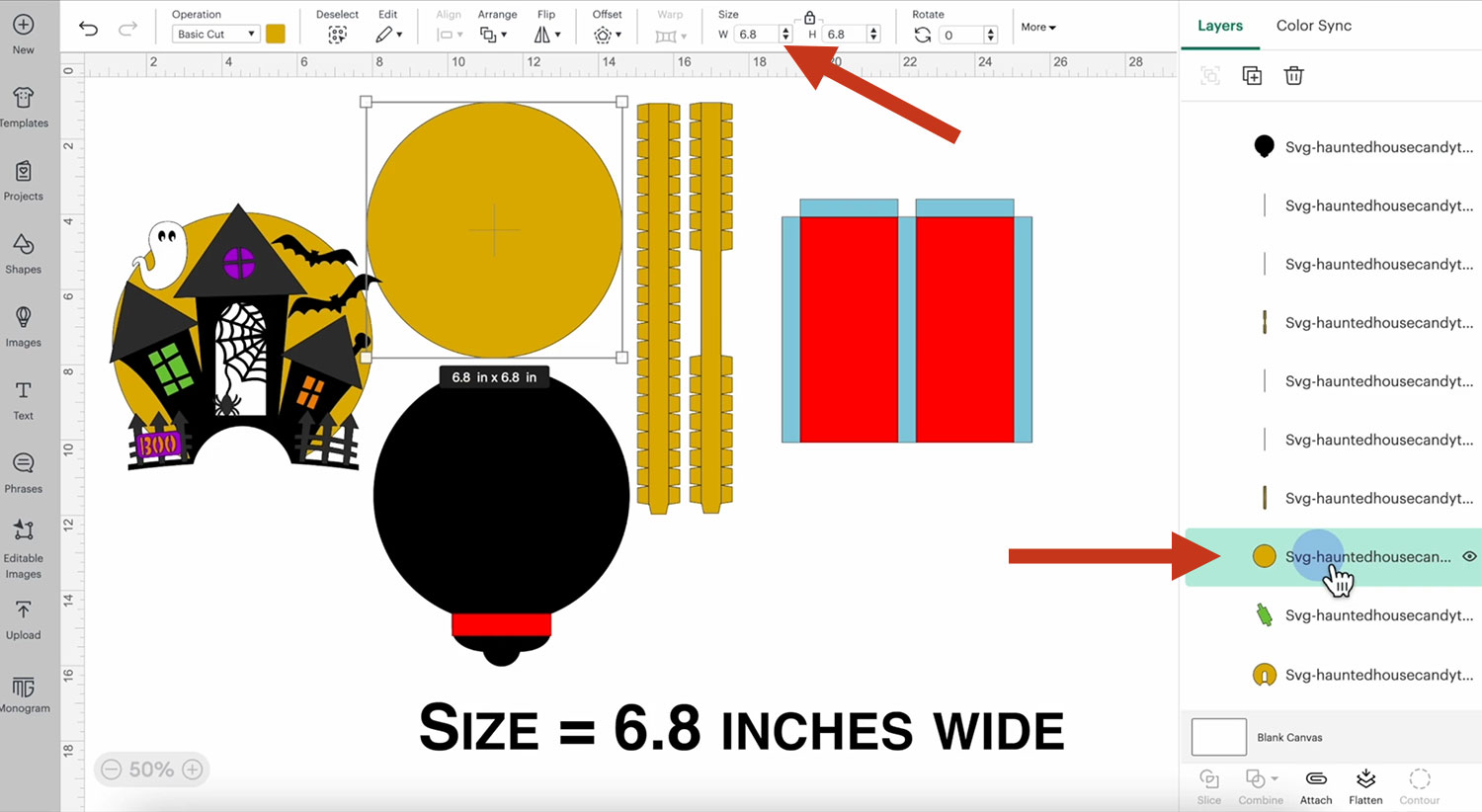 Scroll down the layers panel until you see the solid yellow circle and make sure that it is 6.8 inches wide. This will ensure that your design is the right size.