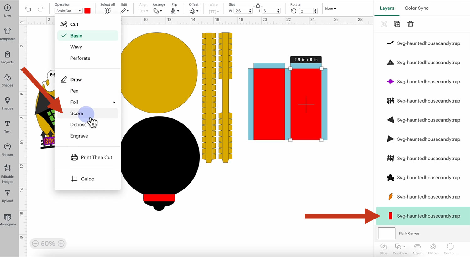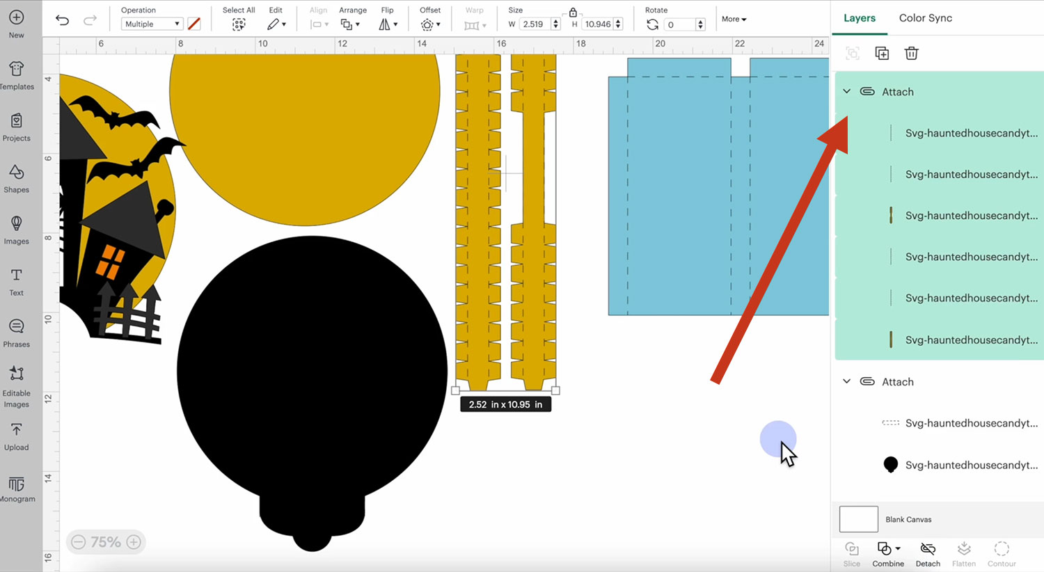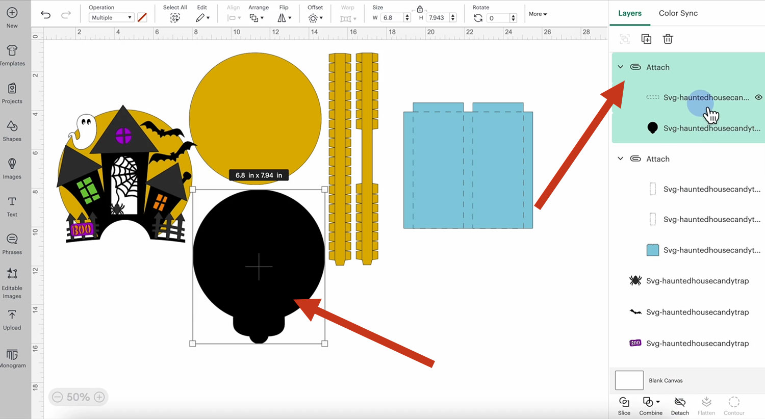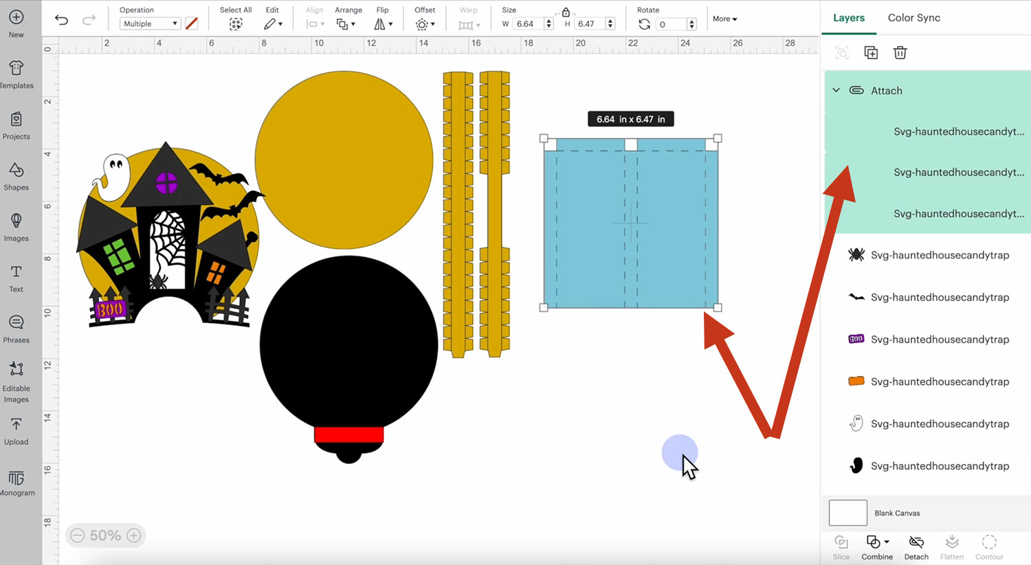Select the rectangles that you’ve just set to “Score” and the blue layer underneath them. Press Attach to make sure the machine scores on top of the blue shape.