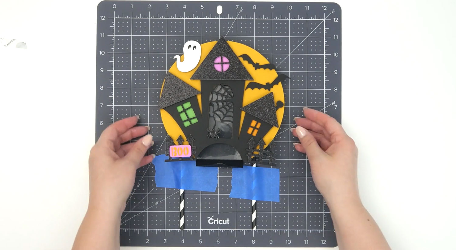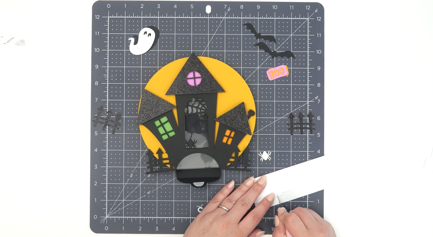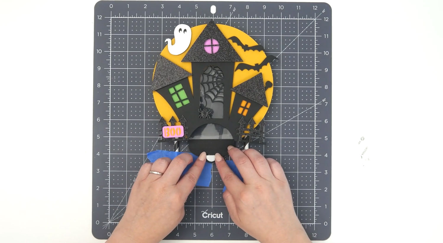 Keep your tape/glue on the outside edges so you don’t see it through the little window of the haunted house.