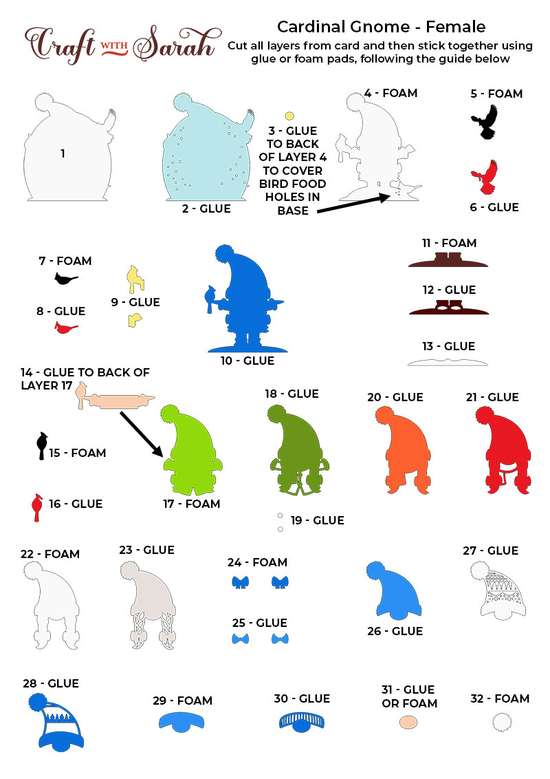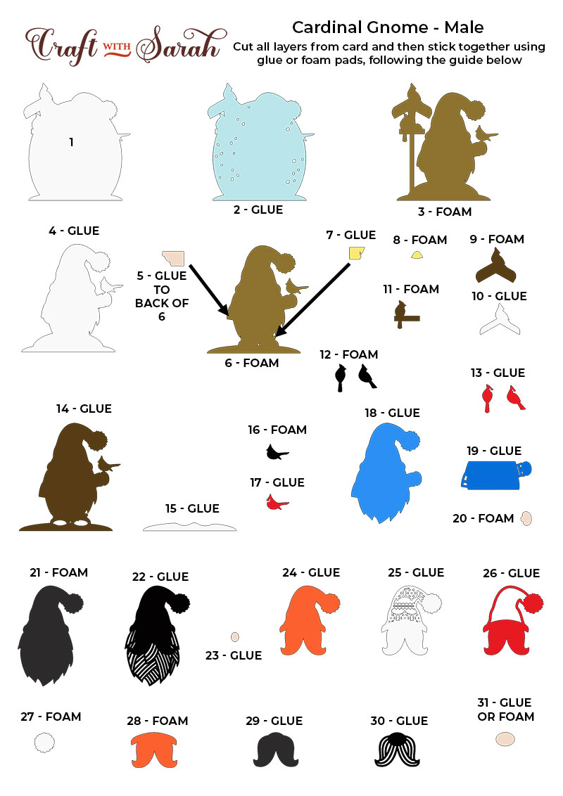 I find it easiest to cut one gnome at a time, rather than doing both the male and female designs at the same time. It gets a little tricky to work out which pieces go with which gnome if you cut them both together, as many of the shapes are similar.