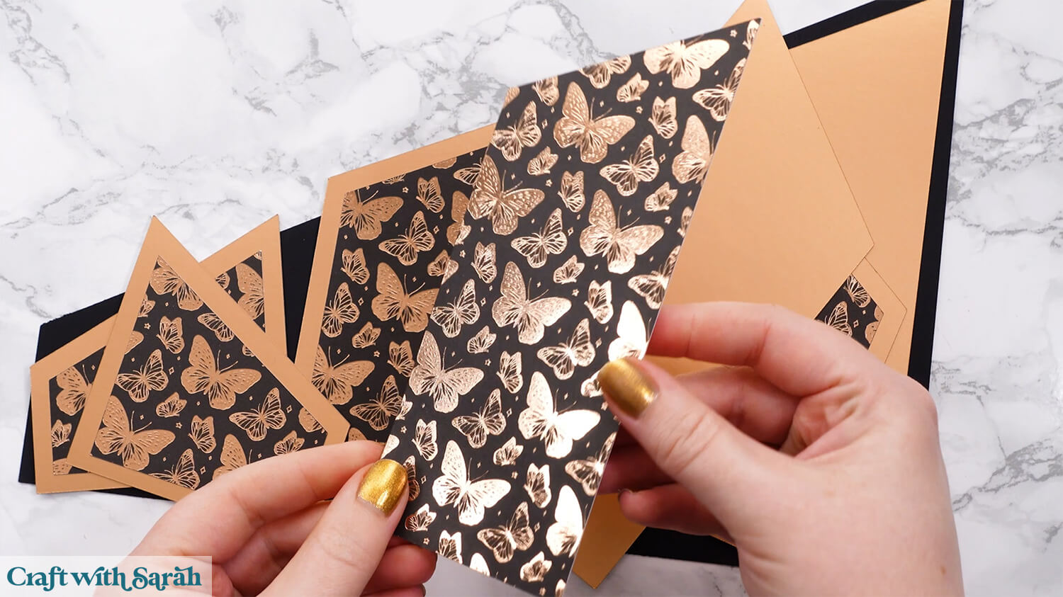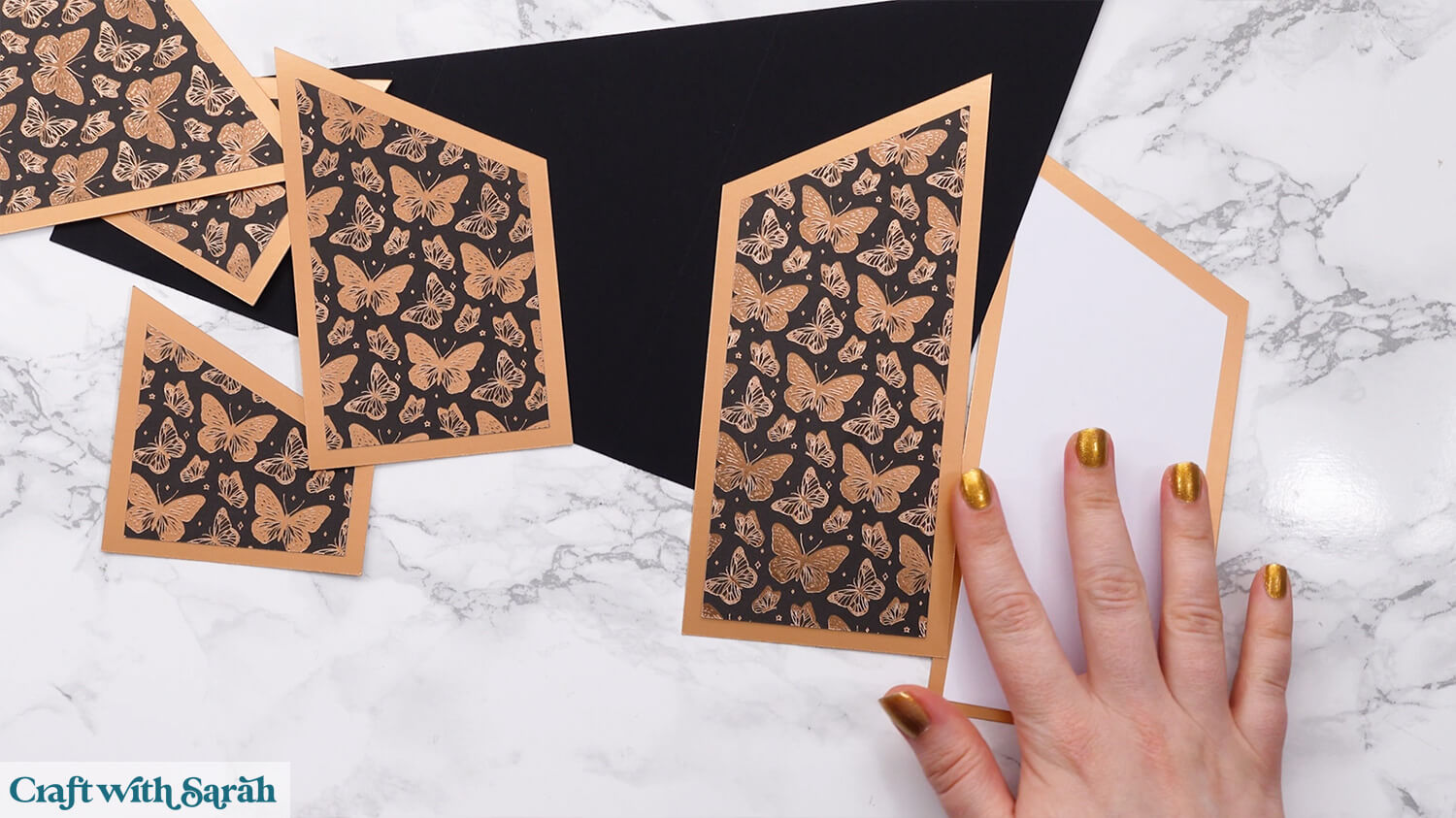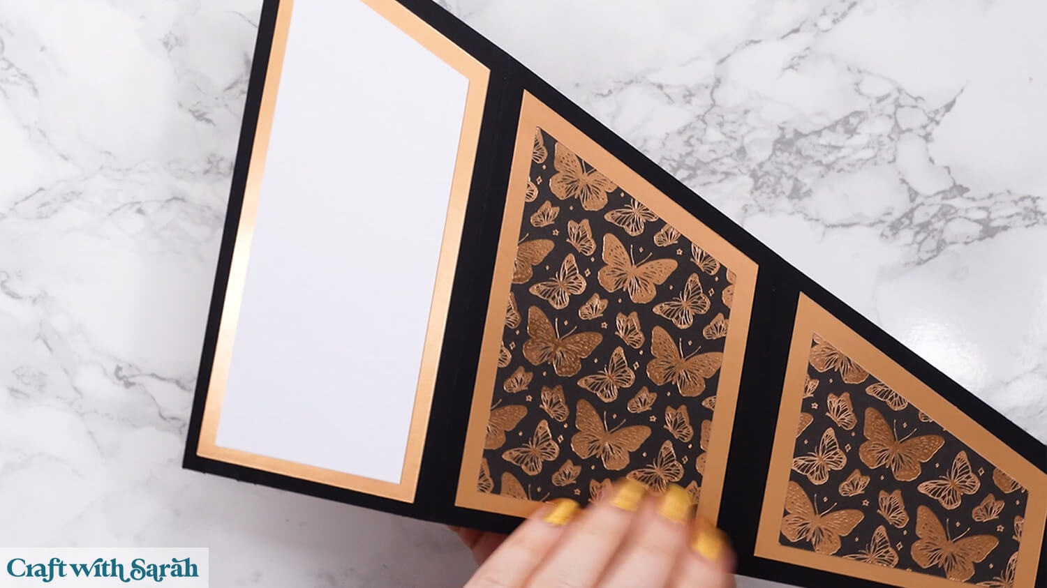 Glue all the patterned paper panels to their coordinating spaces on the base card.