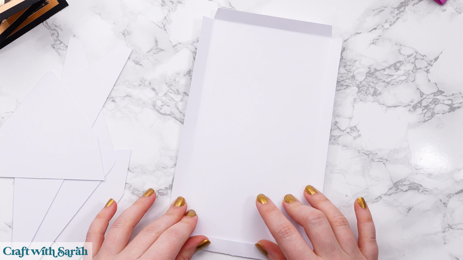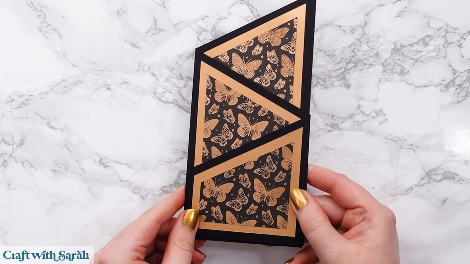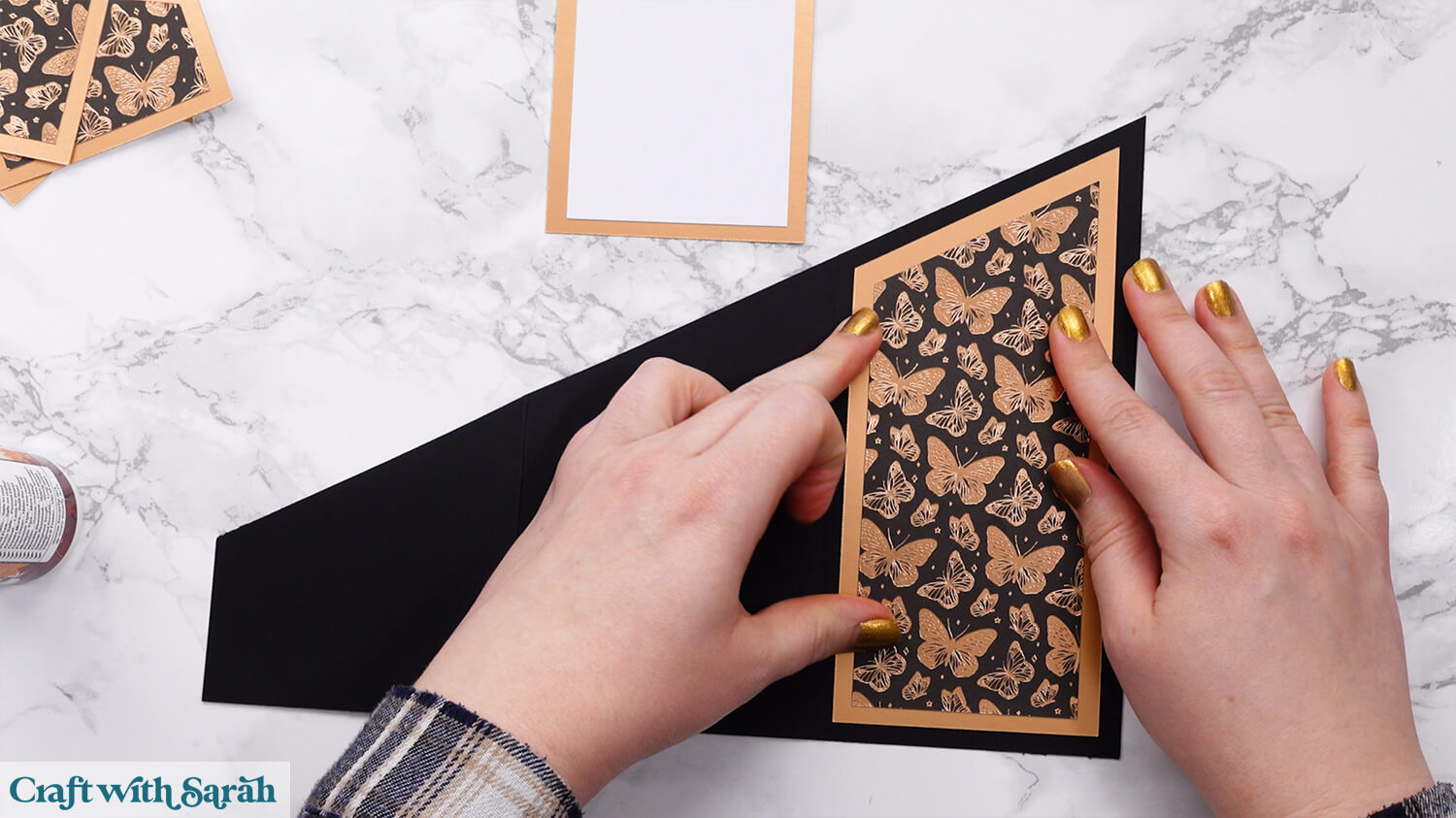 Glue all the patterned paper panels to their coordinating spaces on the base card.
