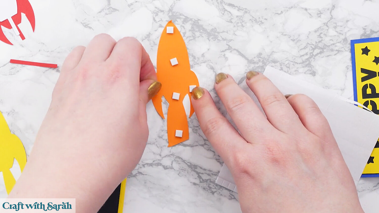 You can either glue all the pieces of the rocket, or make it “pop” out a little by using foam squares to attach the orange cardstock piece.