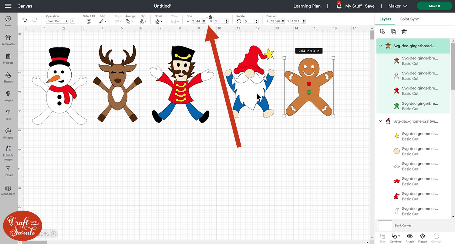 To resize, click one of the designs on your canvas and use the width/height boxes near the top of the screen to make it the size that you want to cut.