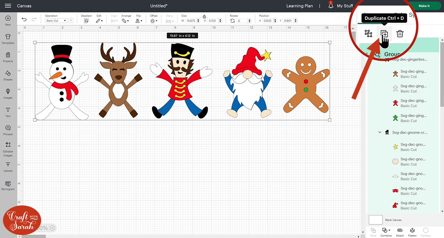 To save space on your cardstock, you can move things around by clicking and dragging. Make sure when you’re moving things about that nothing overlaps, as otherwise it won’t cut out properly