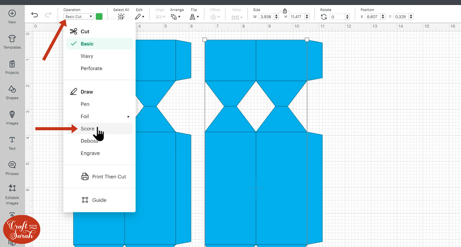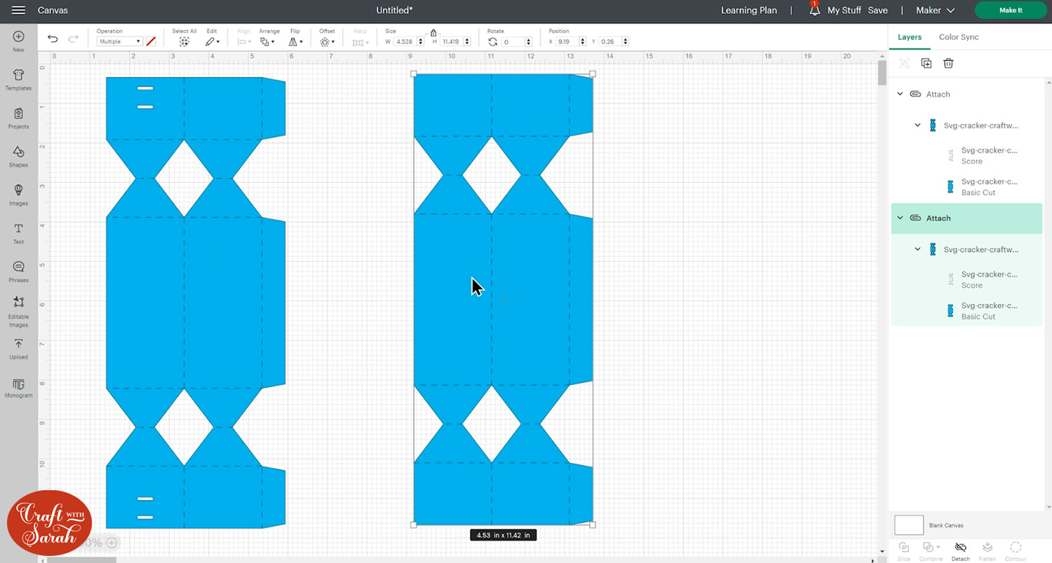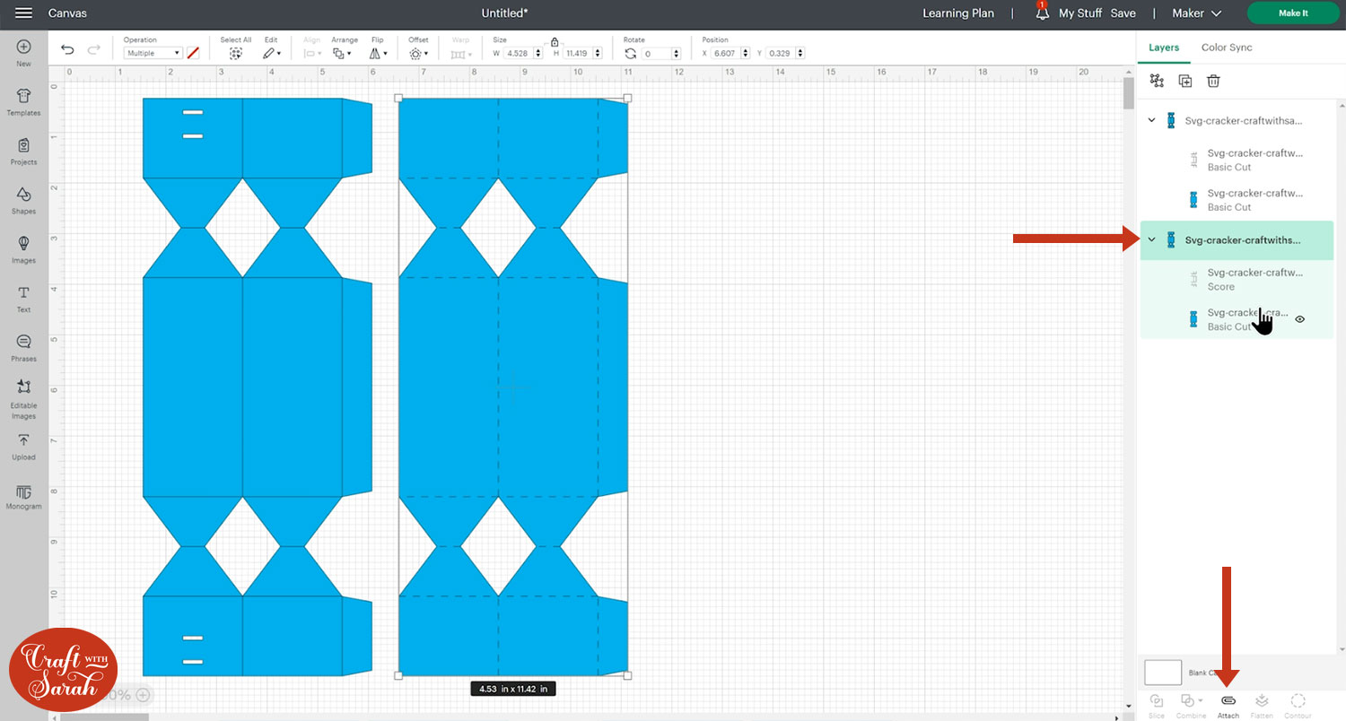Click the Group title in the layers panel so that both of the layers are selected and then press the Attach button. Attach is what tells the Cricut to do the score line on the piece underneath.