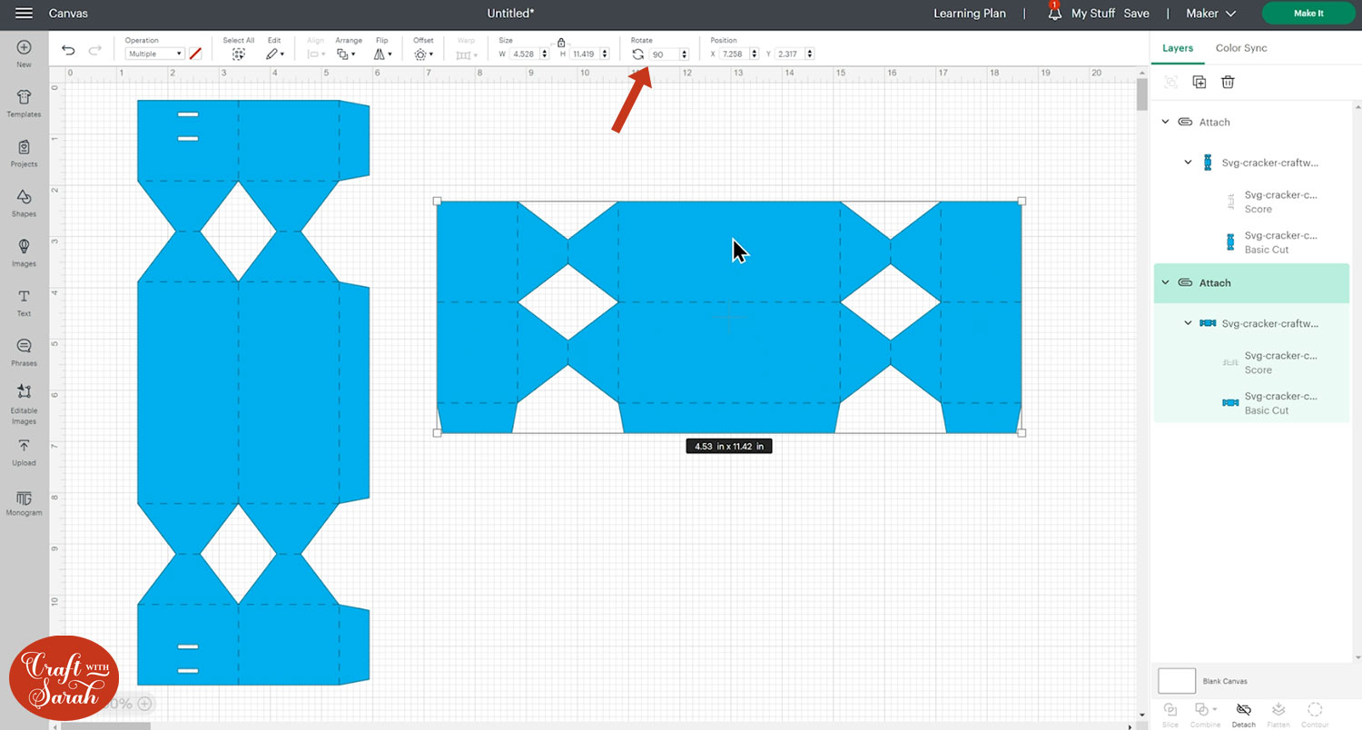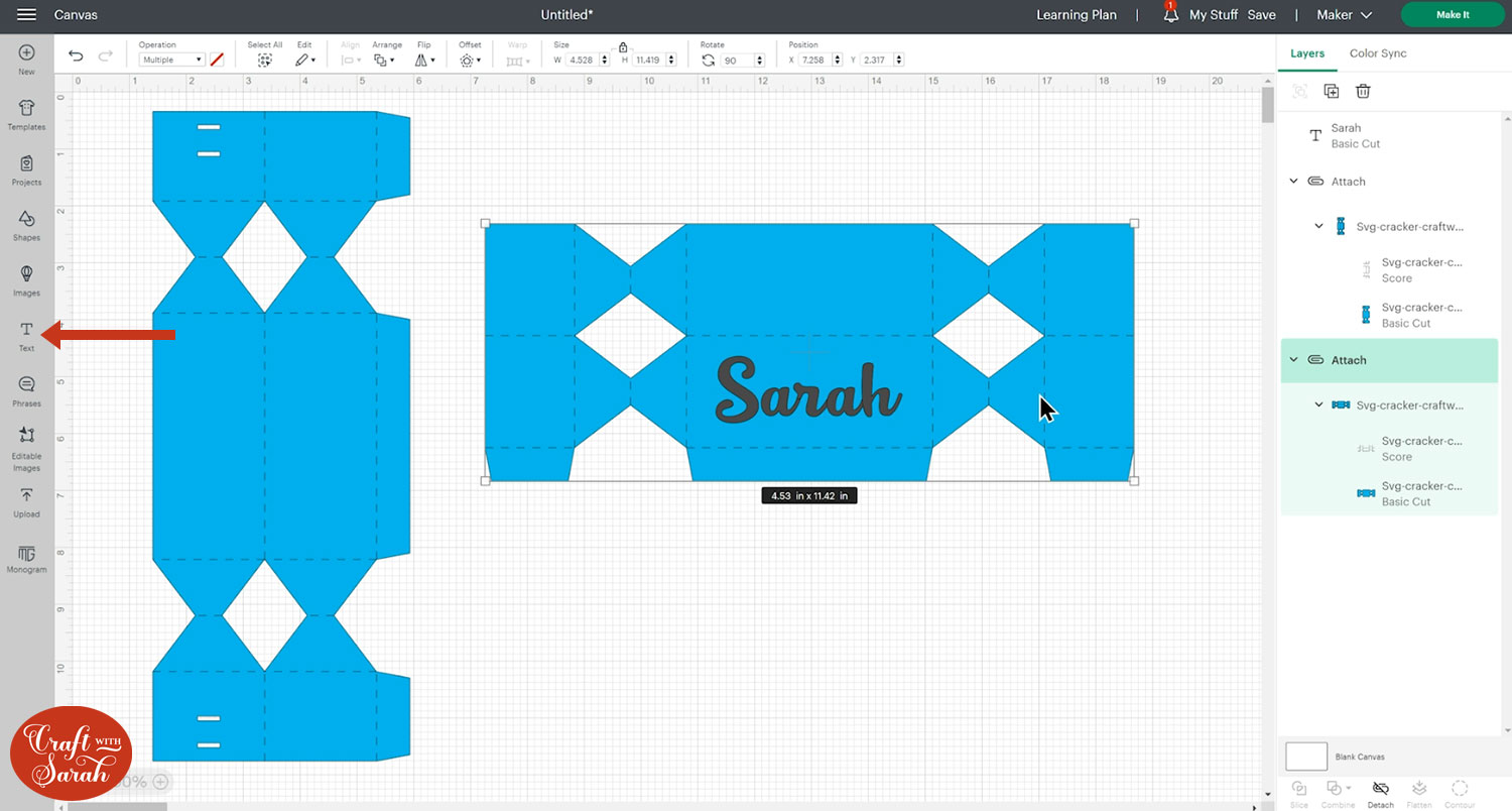 To add a name to the cracker, rotate one of the pieces by 90° by typing 90 in the rotate box and pressing enter on your keyboard. This will make it easier to see the size you are making the name.