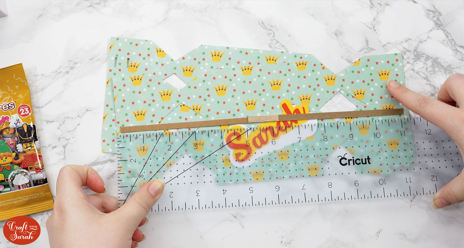 Take the joke, cracker hat and your chosen gift/treat and place them inside. I used a Lego figure for the gift which I taped up slightly to help it fit better inside.