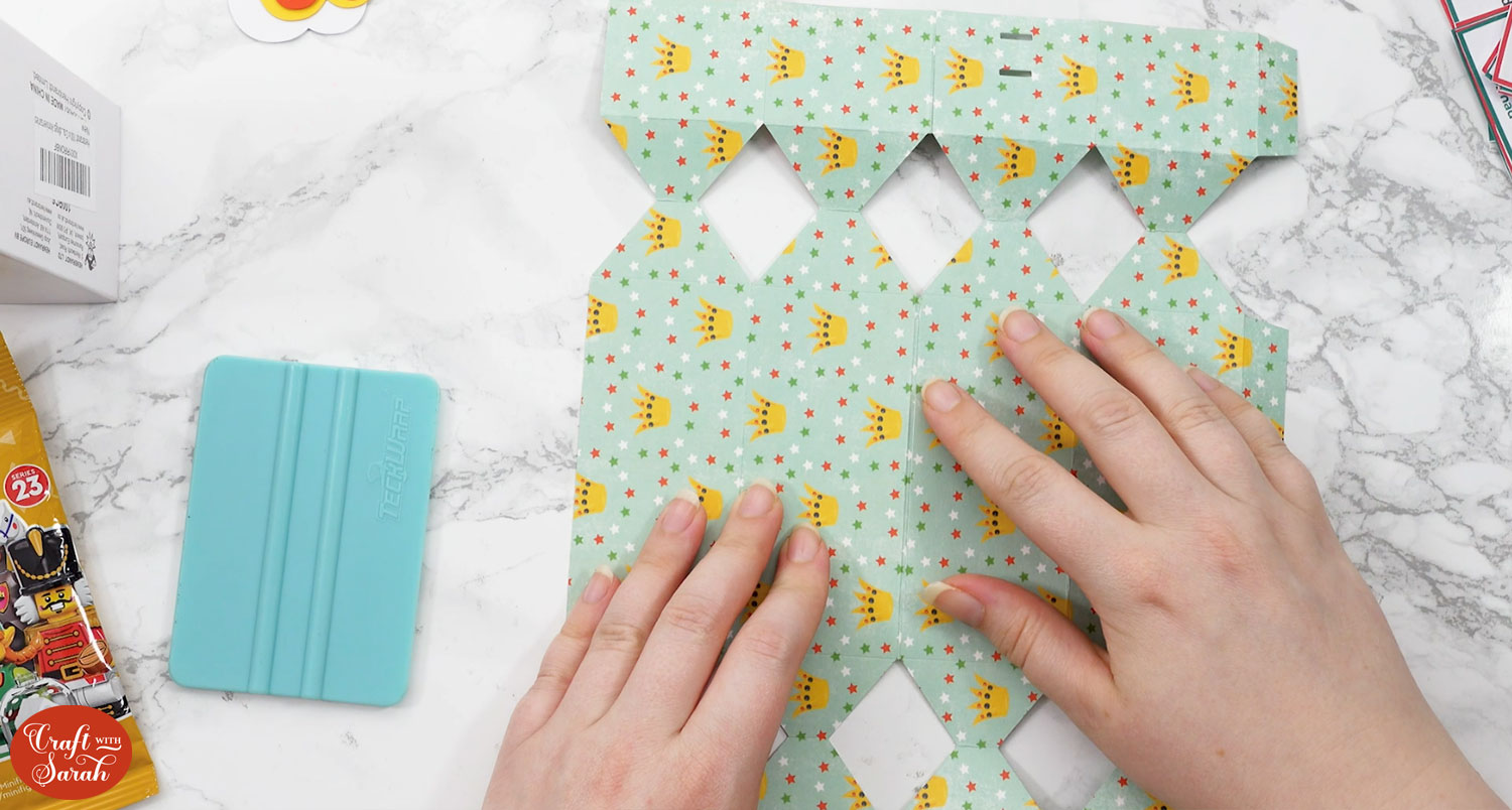 Turn the cracker upside down (so you are looking at the “inside”) and fold inwards along the score lines. Go over the folds with a brayer or scraper tool to give it a crisp crease. You will need to do this for both pieces.