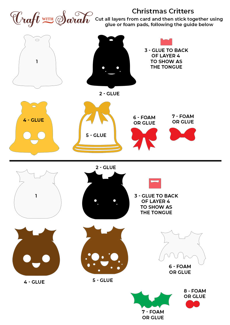For the ornament critters, you can use foam squares for some of the pieces such as the green holly leaves on the Christmas pudding and the bow on the Christmas bell.